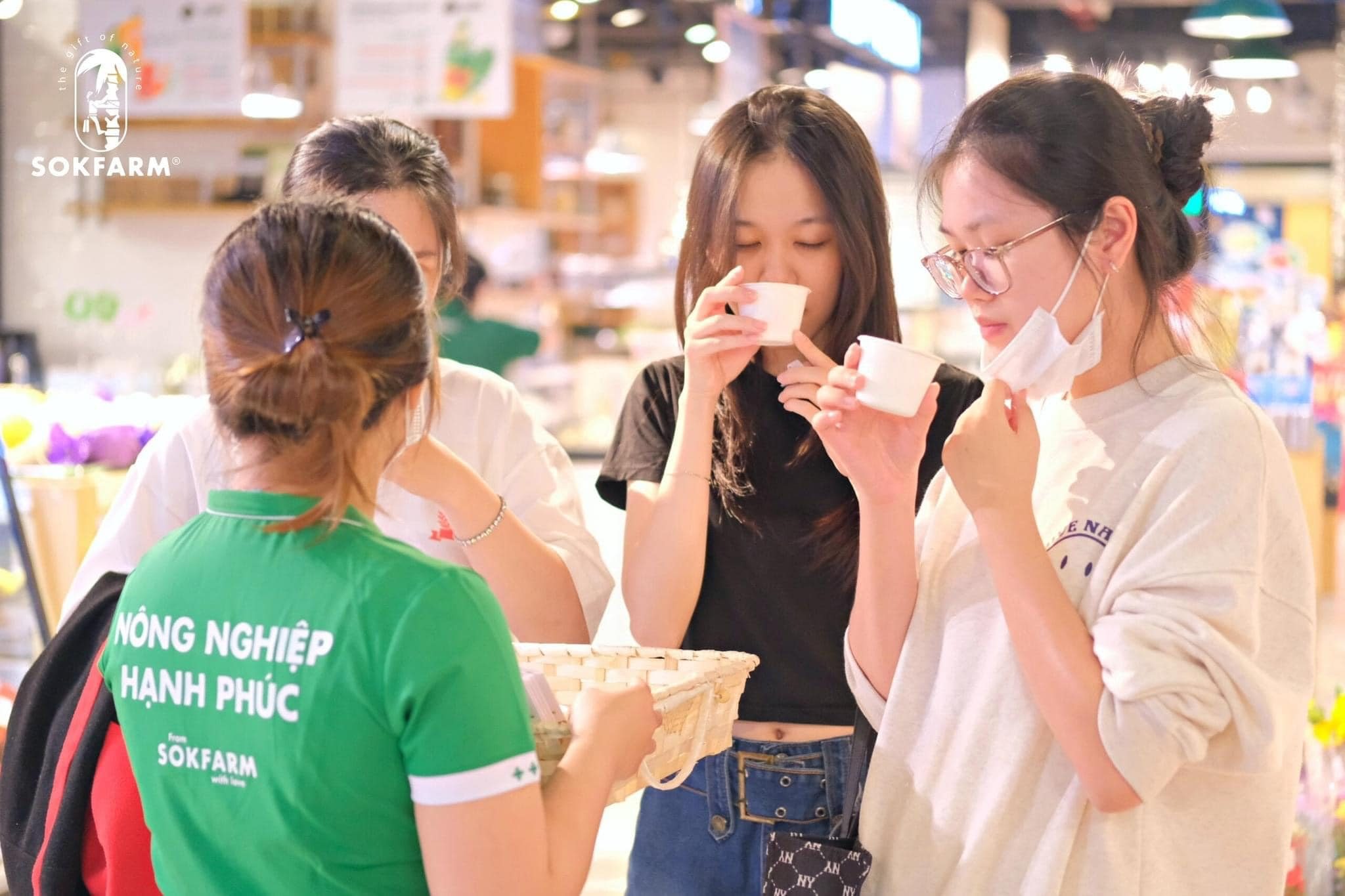 Khách hàng dùng thử sản phẩm mật hoa dừa tươi organic Sokfarm tại chuỗi Farmers Market