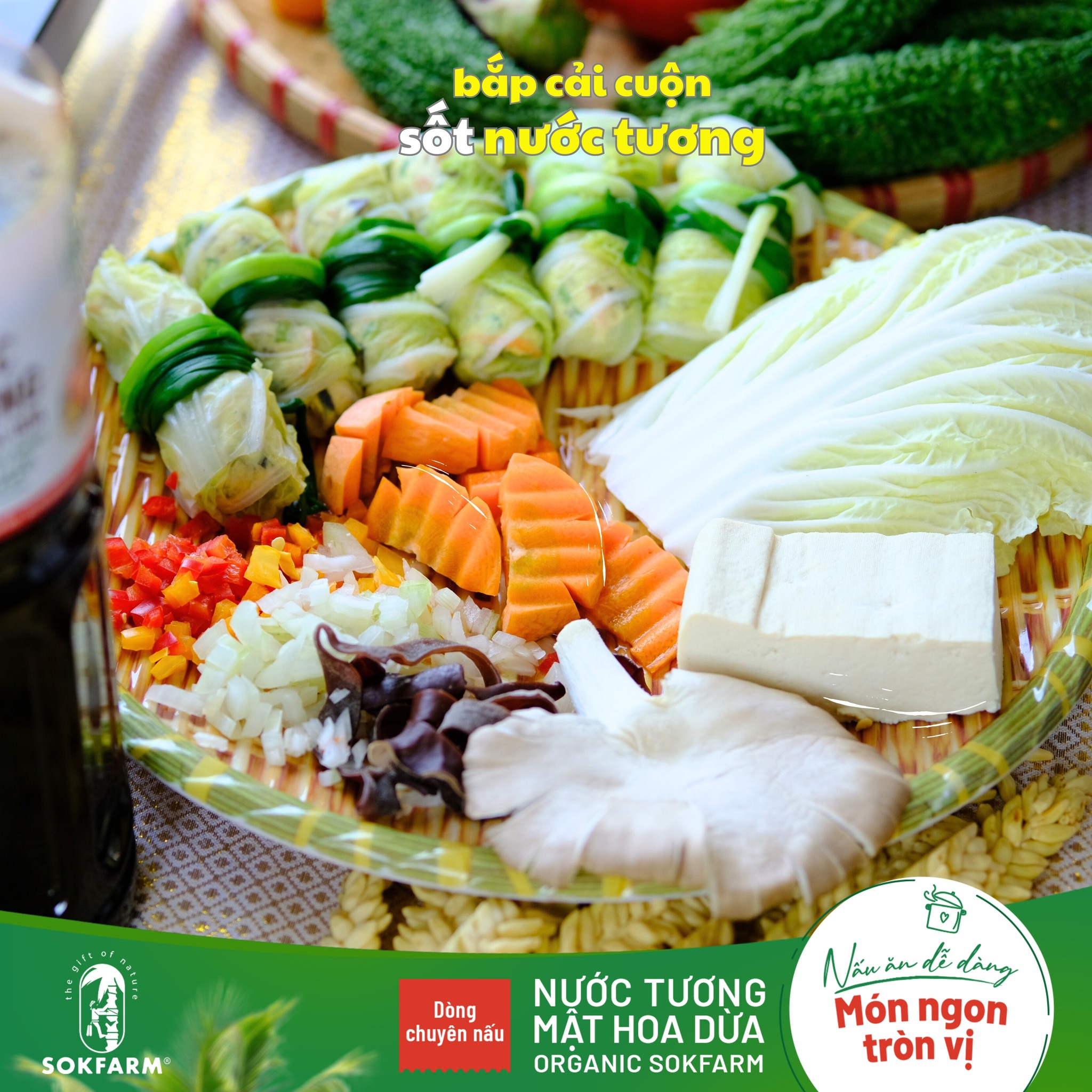 Bắp cải cuộn chay là một món ăn cuốn - trộn không thể bỏ qua với hương vị thơm ngon, độc đáo và cực kỳ dễ chịu, là lựa chọn tốt cho sức khỏe của bạn và gia đình. Đặc biệt, công thức bắp cải cuộn chay và nước tương mật hoa dừa Organic Sokfarm do đầu bếp chay Phương Tâm thực hiện lại càng tốt cho sức khỏe. Vì nước tương mật hoa dừa có vị Umami tự nhiên, thuộc dòng nước tương cắt giảm muối và đặc biệt không từ đậu nành, không biến đổi gen.