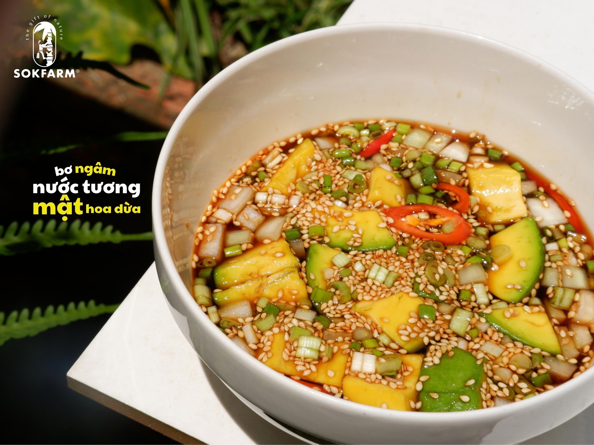 Cách làm: lột vỏ bơ, cắt khúc vừa ăn, cho nước tương mật hoa dừa Sokfarm, mè trắng, ớt vào ngâm khoảng 20 - 30 phút là mình dùng được rồi. Món này ăn với cơm trắng là hết sảy.