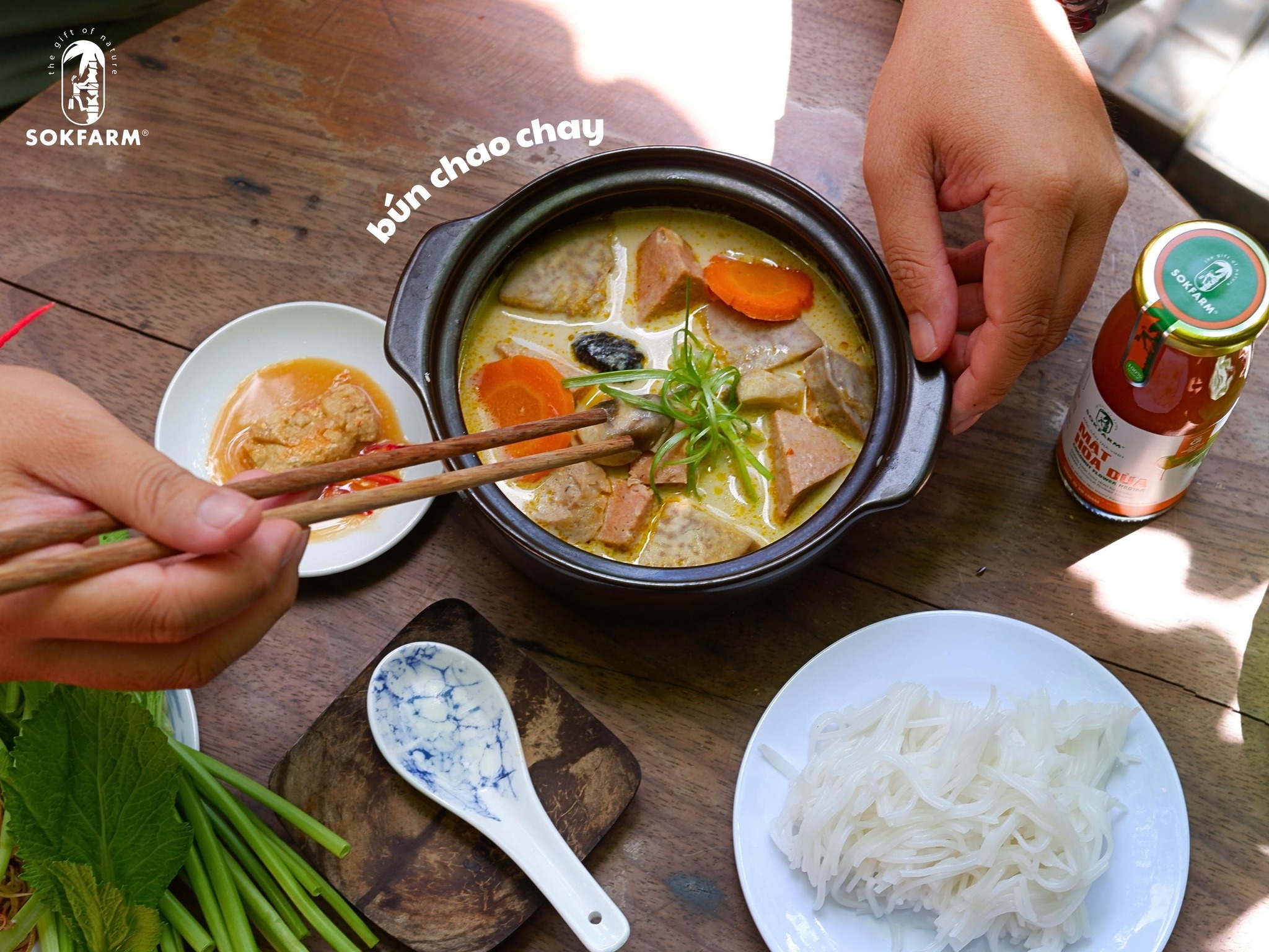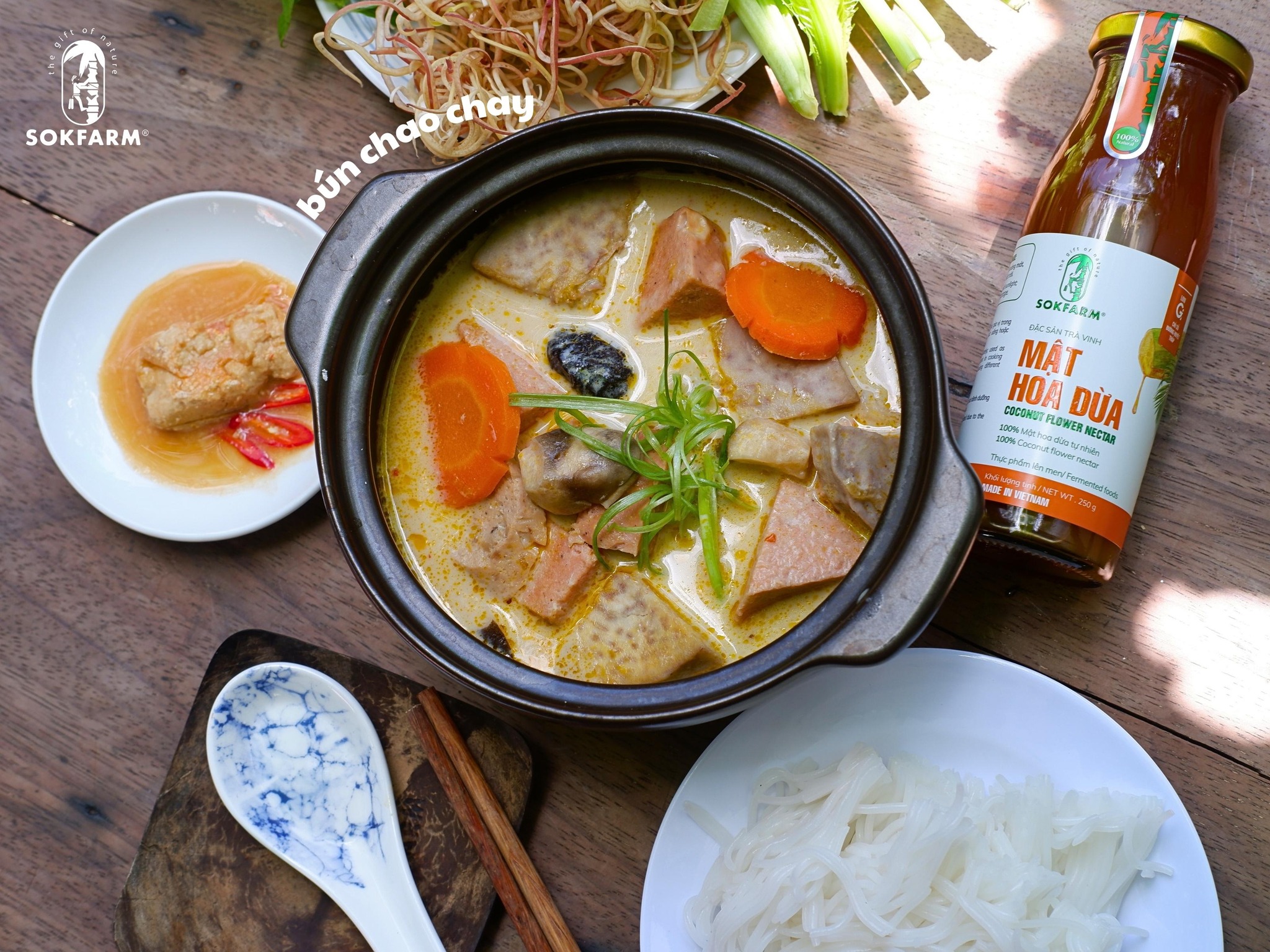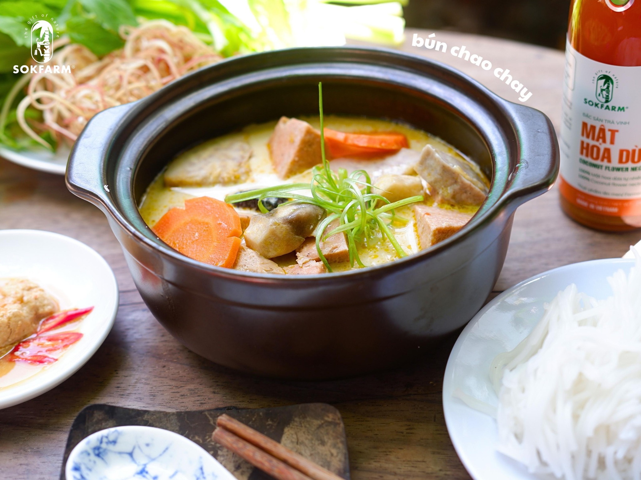 Bún chao chay là món bún nấu theo kiểu Nam bộ, mặc dù là 1 món chay nhưng lại rất giàu vitamin và đủ dinh dưỡng. Vì được nêm nếm cùng mật hoa dừa cô đặc Sokfarm chứa 14 loại axit amin. Bún chao chay mật hoa dừa Sokfarm có vị đậm đà, đặc trưng món ăn Việt.