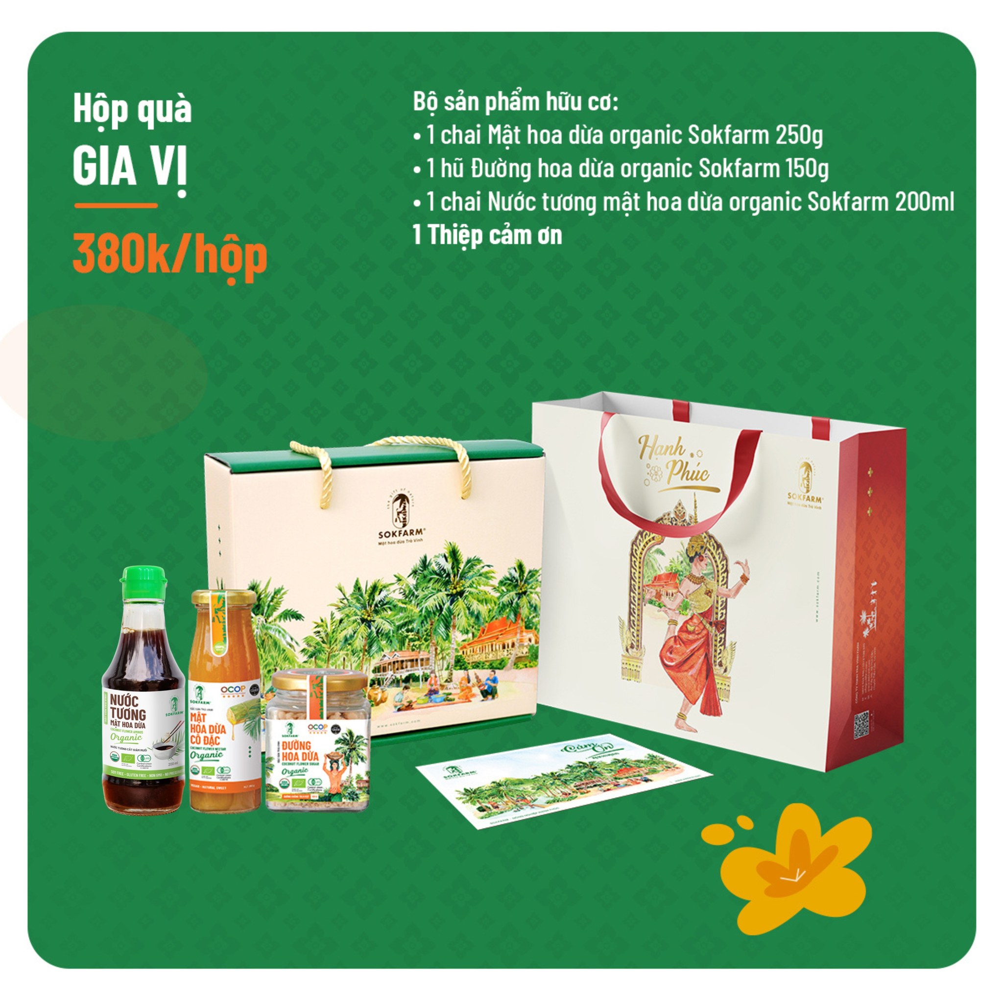 Hộp quà gia vị Sokfarm chỉ 380.000đ, gồm các sản phẩm hữu cơ: Đường hoa dừa, Mật hoa dừa cô đặc, Nước tương mật hoa dừa và 1 thiệp cảm ơn.