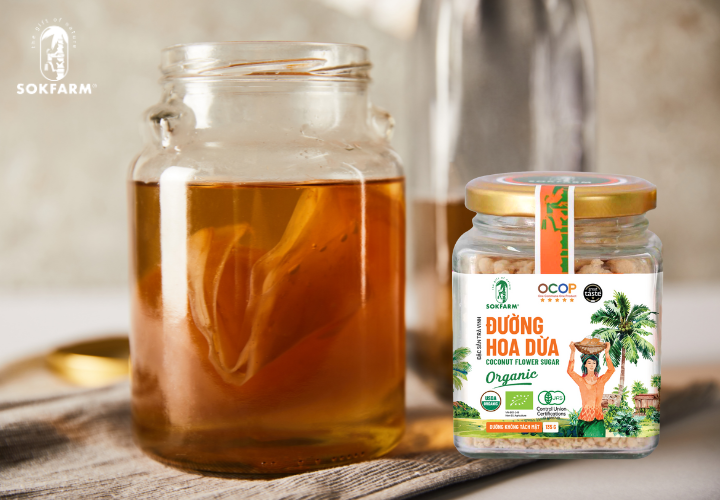 Kombucha được ủ từ đường hoa dừa sẽ có vị chua ngọt hài hòa, dịu nhẹ cùng hương thơm thoang thoảng của mật hoa dừa - nguyên liệu làm ra loại đường này. Chính vì thế, mà đôi khi trà còn có tên gọi là kombucha mật hoa dừa. Chỉ số đường huyết của đường hoa dừa nằm ở mức thấp GI<41 nên khi ủ kombucha thì người ăn kiêng vẫn có thể an tâm sử dụng.
