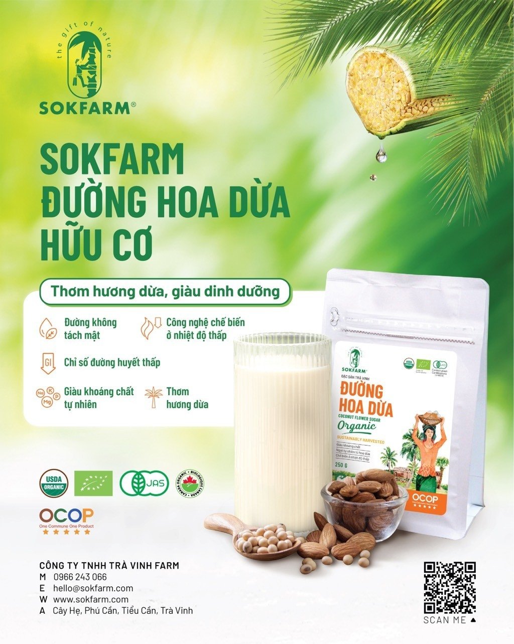 Đường hoa dừa Sokfarm là một sản phẩm hoàn toàn thiên nhiên, được cô đặc từ mật hoa dừa ở nhiệt độ thấp 55 – 60oC. Do được cô đặc ở nhiệt độ thấp nên đường hoa dừa hữu cơ Sokfarm vẫn giữ lại được các thành phần dinh dưỡng và khoáng chất có trong mật hoa dừa. Nhà máy sản xuất và vùng nguyên liệu đạt chuẩn hữu cơ USDA, FDA, JAS, CANADA, ISO 22000.
