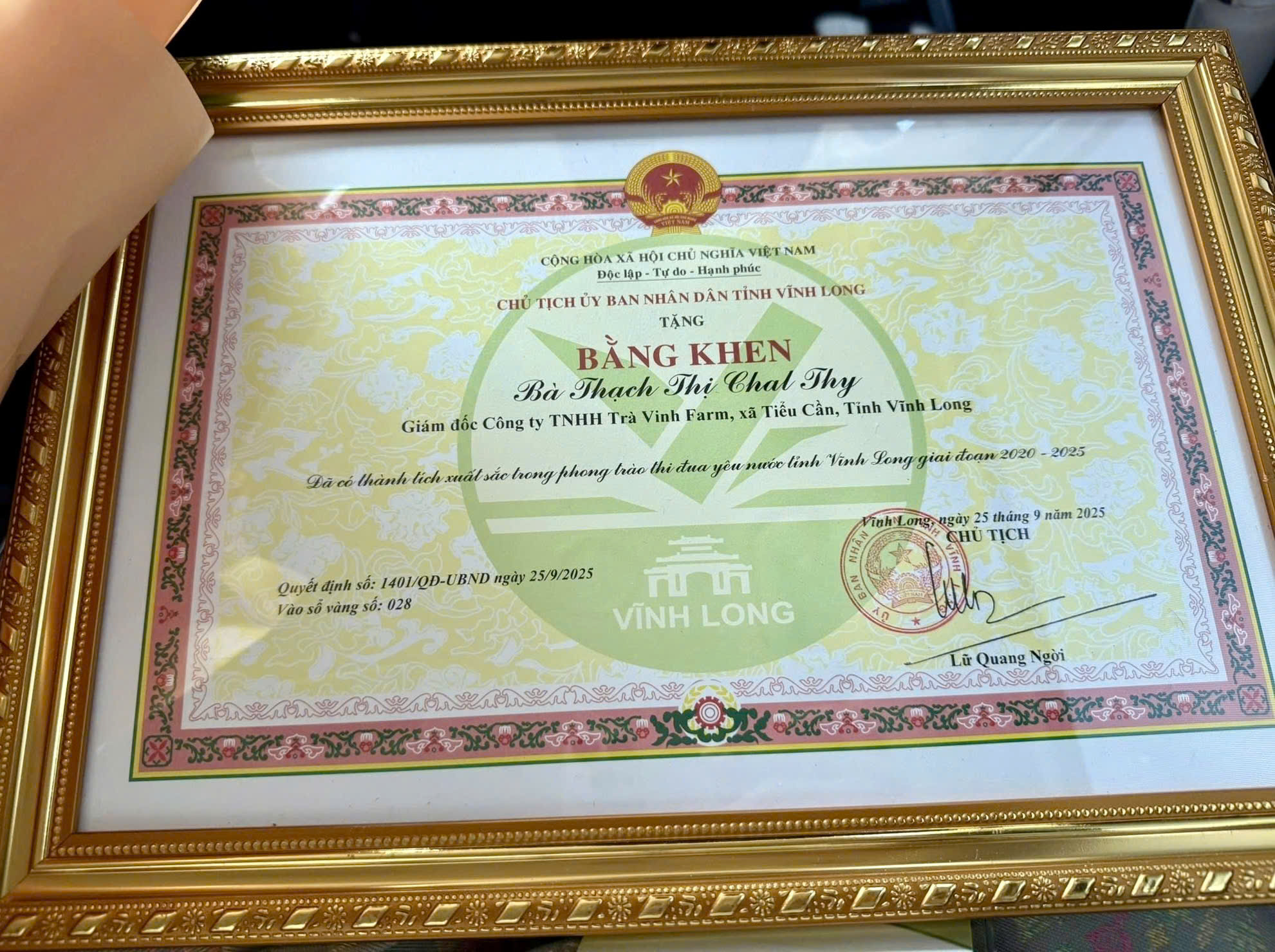 Chị Thạch Thị Chal Thi – Giám đốc Sokfarm – nhận bằng khen từ Chủ tịch UBND tỉnh Vĩnh Long