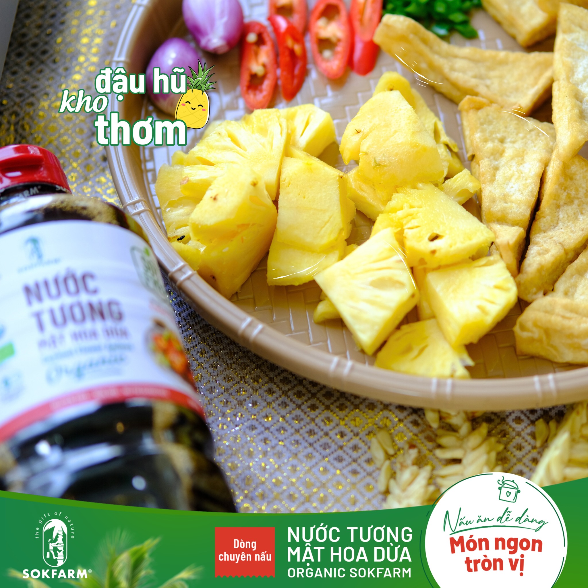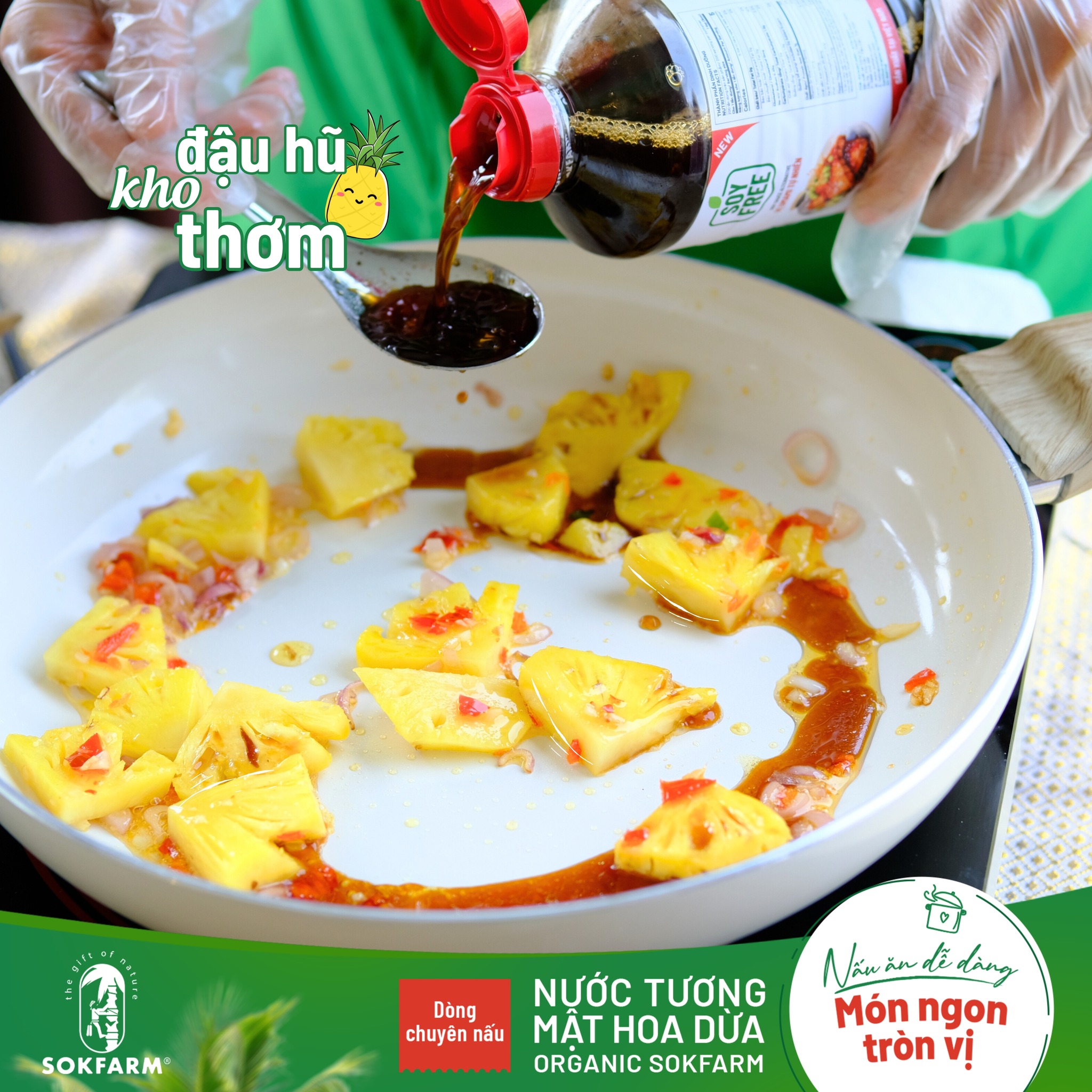 - Nêm món ăn với 3 muỗng nước tương mật hoa dừa hữu cơ Sokfarm - Dòng chuyên nấu, ½ muỗng mật hoa dừa cô đặc. Nấu đến khi đậu hũ và thơm (khóm) thấm sốt. Ngoài ra bạn có thể tùy chỉnh lượng gia vị cho phù hợp với gia đình mình nhé!