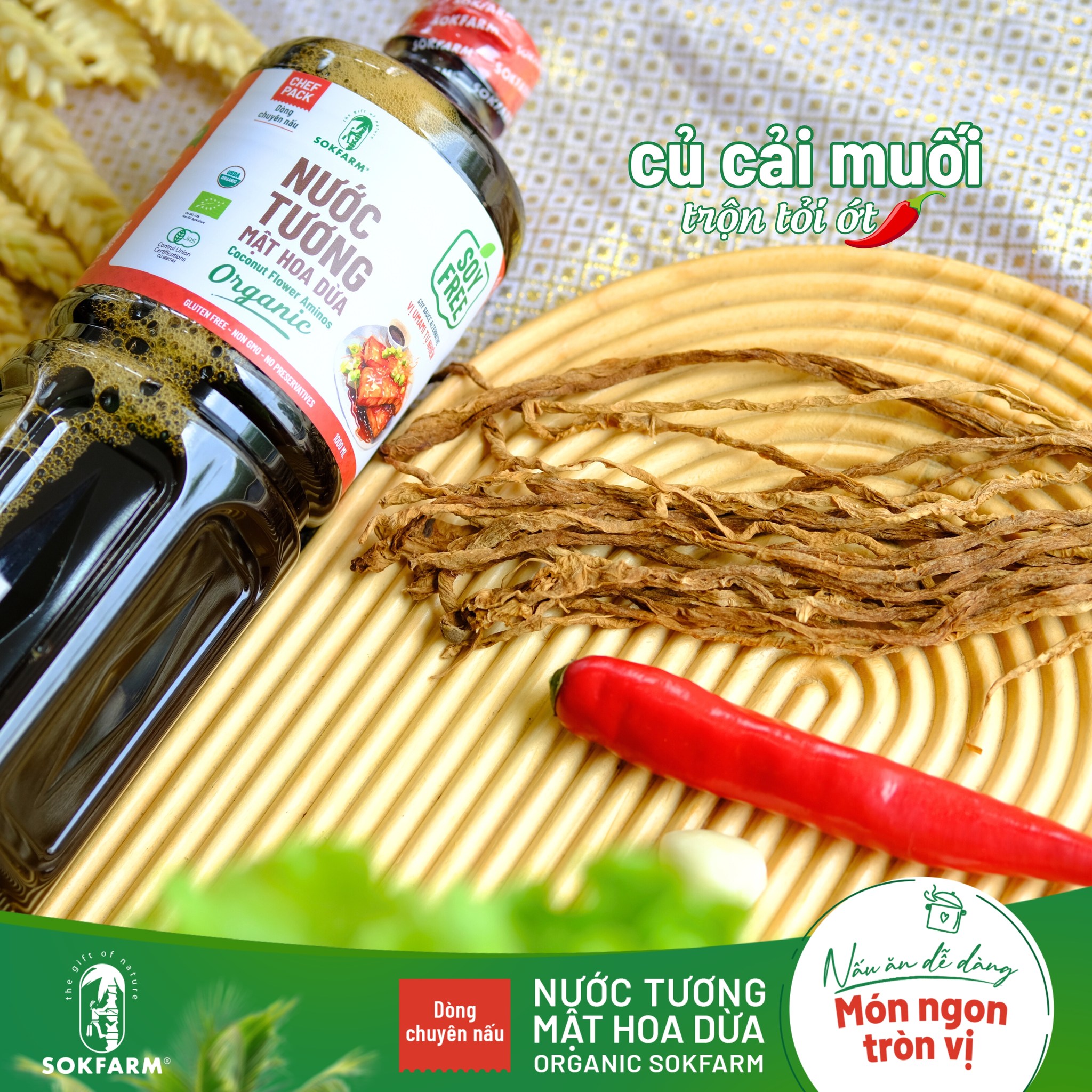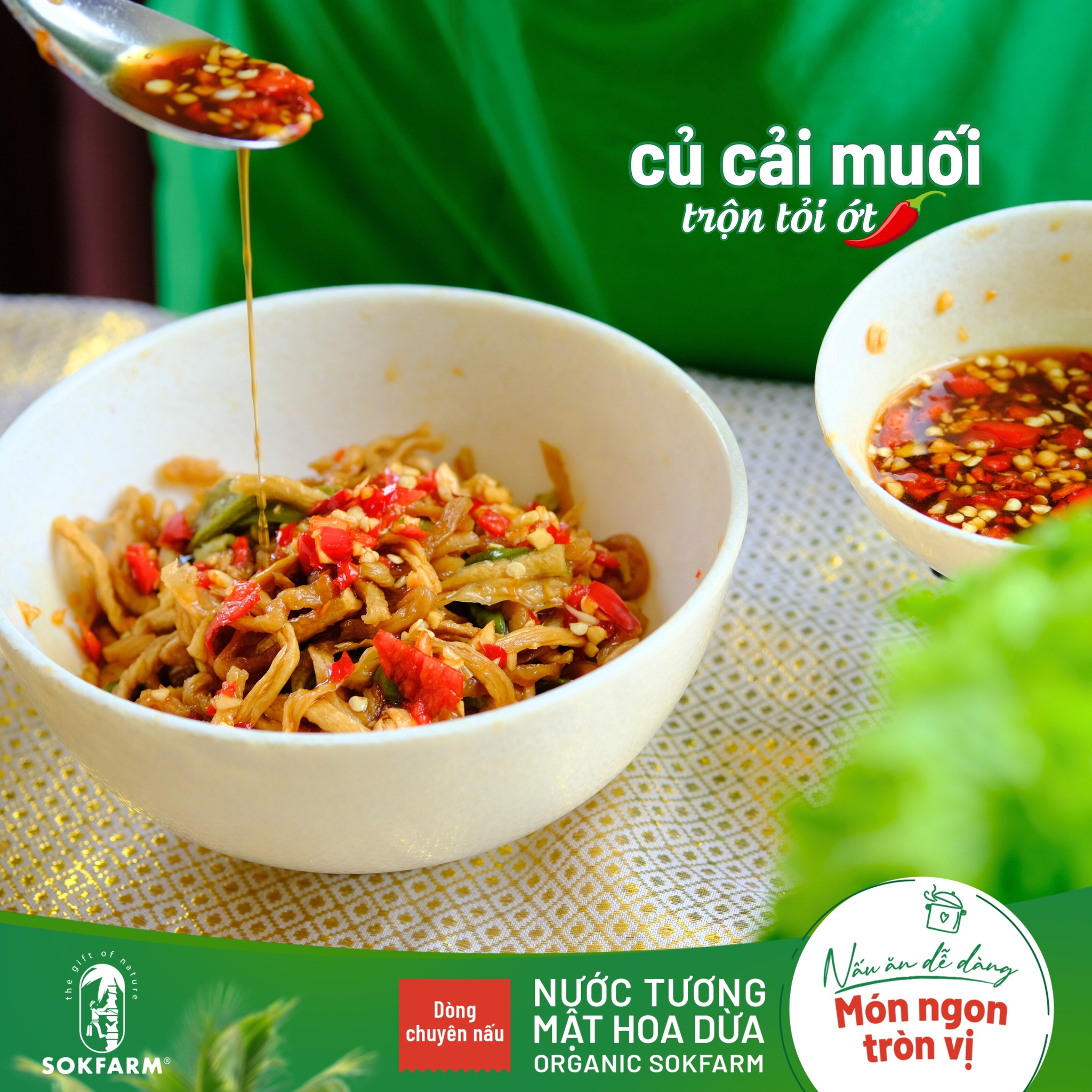 Củ cải muối là món ăn kèm dân dã, dễ thực hiện và có thể kết hợp với nhiều món ăn chính. Còn nếu bạn muốn biến củ cải muối thành món ăn chính vào những ngày rằm, hãy tham khảo thử công thức củ cải muối trộn tỏi, ớt và nước tương mật hoa dừa hữu cơ Sokfarm giảm mặn nhé!
