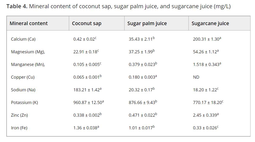 Qua hình cho thấy, hàm lượng khoáng chất trong mật hoa dừa cao hơn so với đường thốt nốt và nước mía. Hàm lượng khoáng chất chiếm nhiều nhất trong mật hoa dừa là kali và natri: