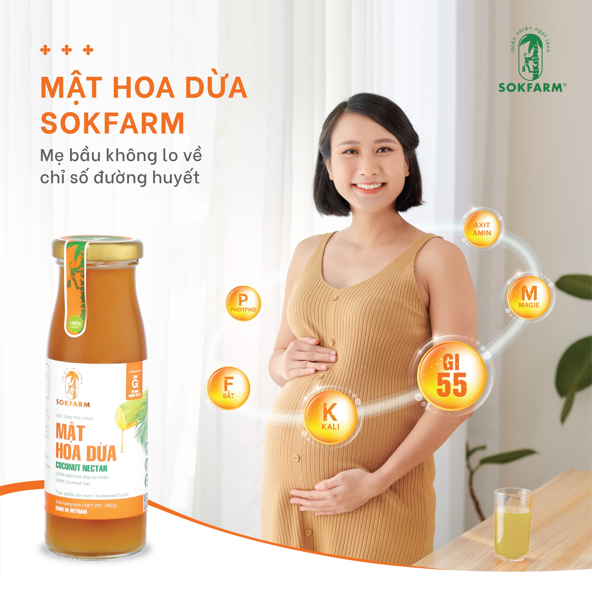 Không chỉ đảm bảo độ tươi ngon, sản phẩm còn cung cấp một lượng vừa đủ sucrose, glucose và fructose cho mẹ bầu. Sử dụng Mật hoa dừa hữu cơ Sokfarm hỗ trợ mẹ bầu kiểm soát lượng đường trong máu: Mật hoa dừa có chỉ số đường huyết thấp. Như đã đề cập ở trên, bên cạnh chế độ ăn uống phù hợp, cân bằng dinh dưỡng, đảm bảo đủ năng lượng, mẹ bầu cần lưu ý lựa chọn những sản phẩm có chỉ số đường huyết phù hợp. Chỉ số đường huyết (GI) có trong sản phẩm mật hoa dừa là 55.2. Đây là chỉ số trung bình, trong khi đường tinh luyện có chỉ số GI= 64 và glucose GI = 100. Khi sử dụng mật hoa dừa, đường huyết của mẹ bầu không bị tăng đột ngột. Việc duy trì đường máu ổn định giúp hạn chế tình trạng mắc đái tháo đường cho phụ nữ mang thai. Mật hoa dừa cung cấp vitamin B1, B2, B3, B6 cùng các axit amin thiết yếu cho cơ thể. Mật hoa dừa chứa một lượng fructose rất thấp, nhưng lại chứa một lượng lớn khoáng chất cần thiết cho cơ thể như magie, sắt, kẽm kali… Không chỉ đem lại cảm giác ngon miệng, giảm nghén ngọt, sản phẩm còn hỗ trợ làm đẹp da và tóc cho mẹ bầu.