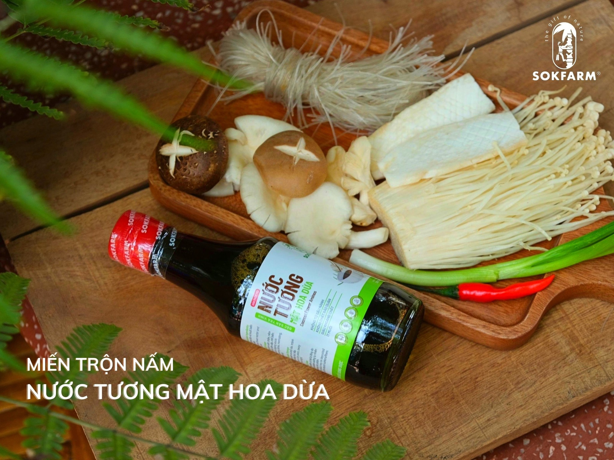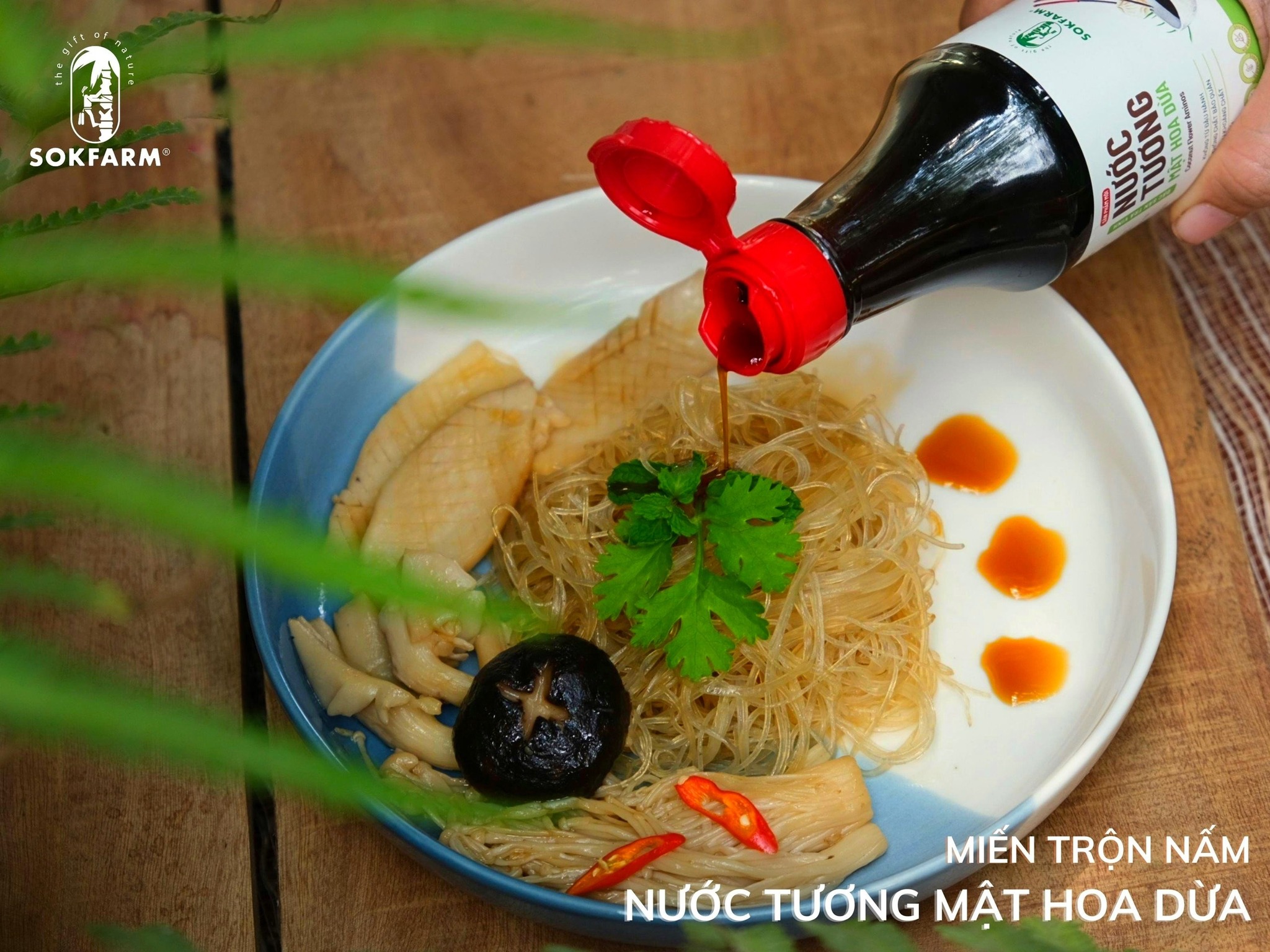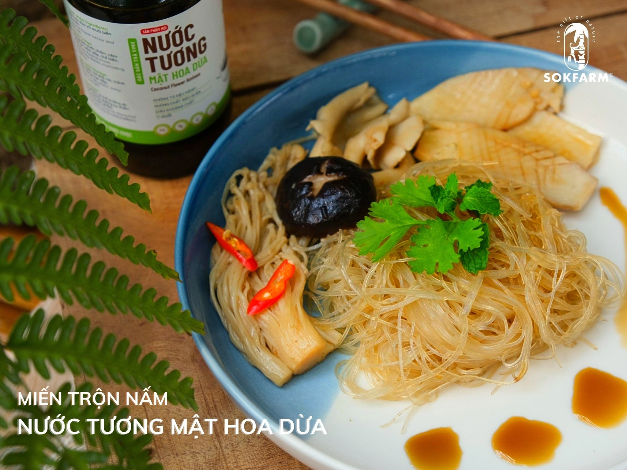 Miến trộn nấm với nước tương mật hoa dừa tuy đơn giản nhưng lại nhiều chất dinh dưỡng và phù hợp với tất cả thành viên trong gia đình. Vì nước tương mật hoa dừa Sokfarm là nước chấm được lên men tự nhiên từ mật hoa dừa và hoa muối. Sản phẩm có hàm lượng muối ít hơn 65% so với nước tương từ đậu nành, không thêm đường, không phụ gia thực phẩm và không chất bảo quản.