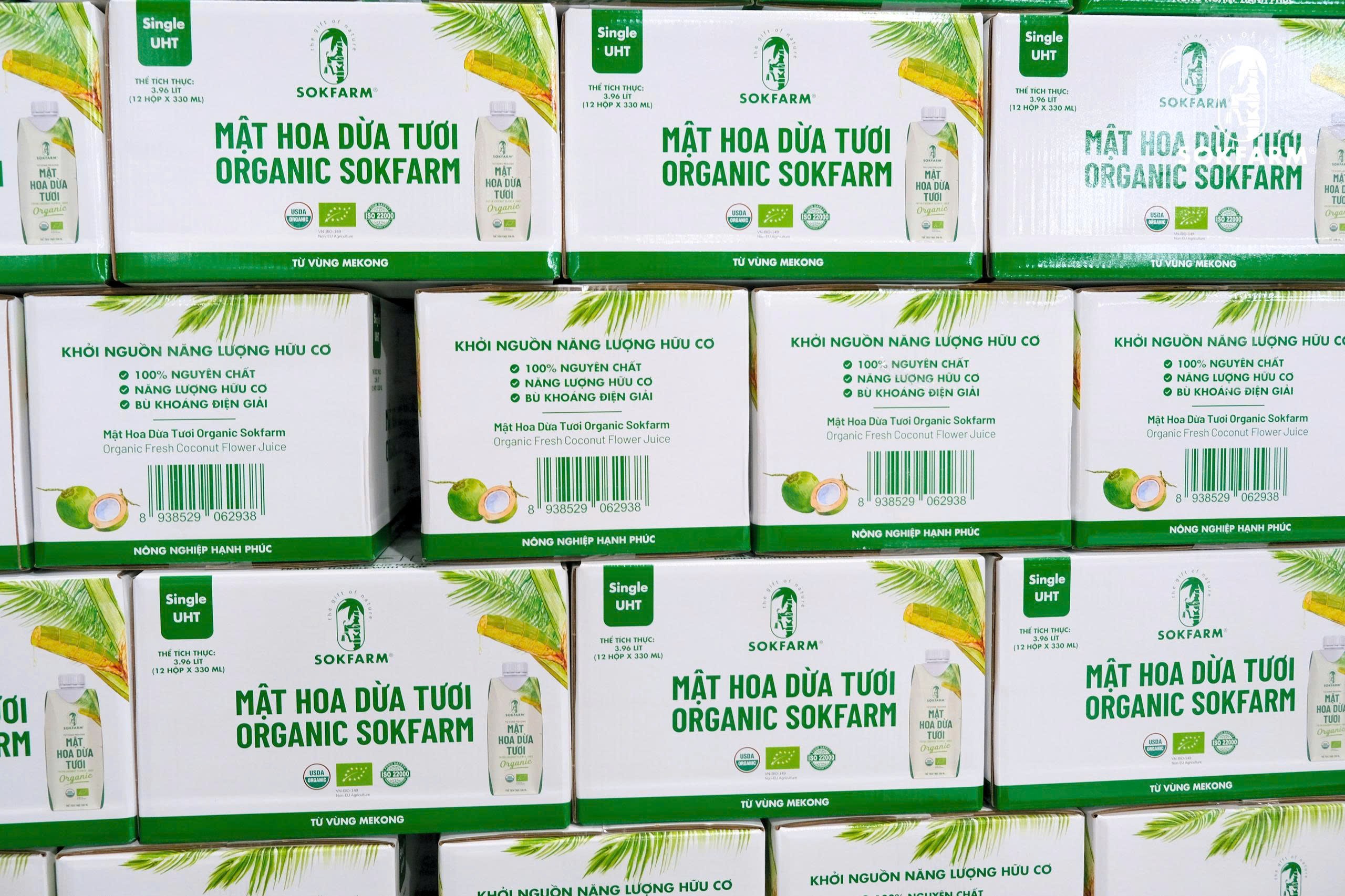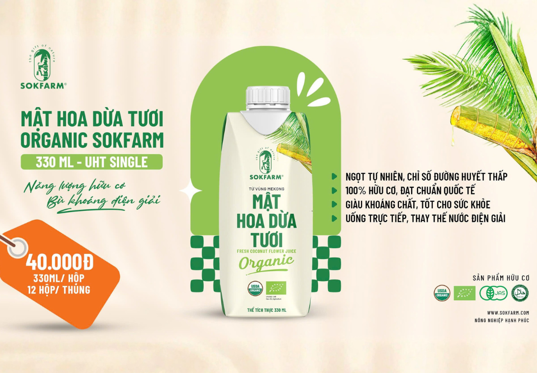 Sokfarm là doanh nghiệp tiên phong tại Việt Nam sản xuất Mật hoa dừa tươi hữu cơ dạng uống liền, được chế biến bằng công nghệ UHT (Ultra High Temperature) – tiệt trùng ở nhiệt độ cao trong vài giây giúp loại bỏ vi sinh vật, mà vẫn giữ nguyên vitamin, khoáng chất và hương vị tươi mát tự nhiên.