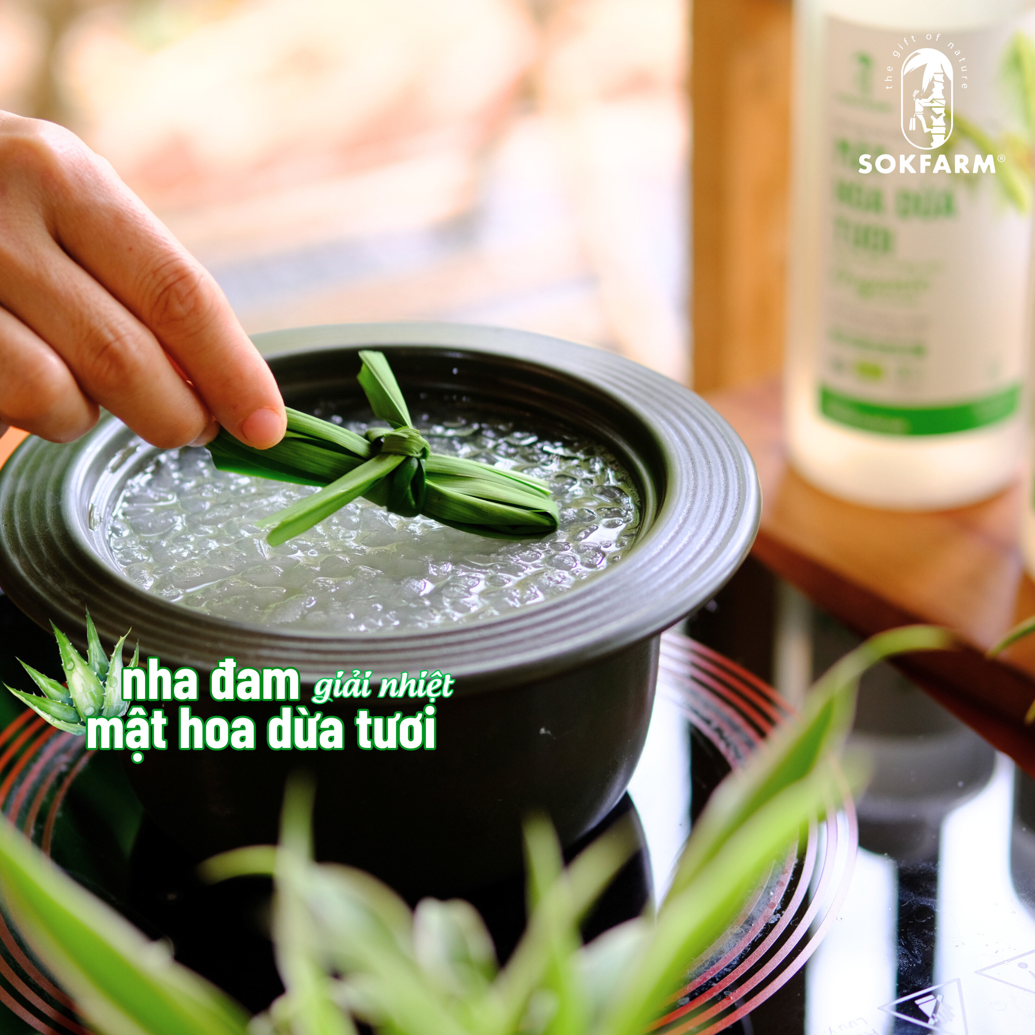 - Bước 3: Bạn có thể uống nóng hoặc thêm đá vào ly thức uống và thưởng thức. Mỗi ngụm, bạn sẽ cảm nhận được vị ngọt tự nhiên của mật hoa dừa, vị thanh mát của nha đam.