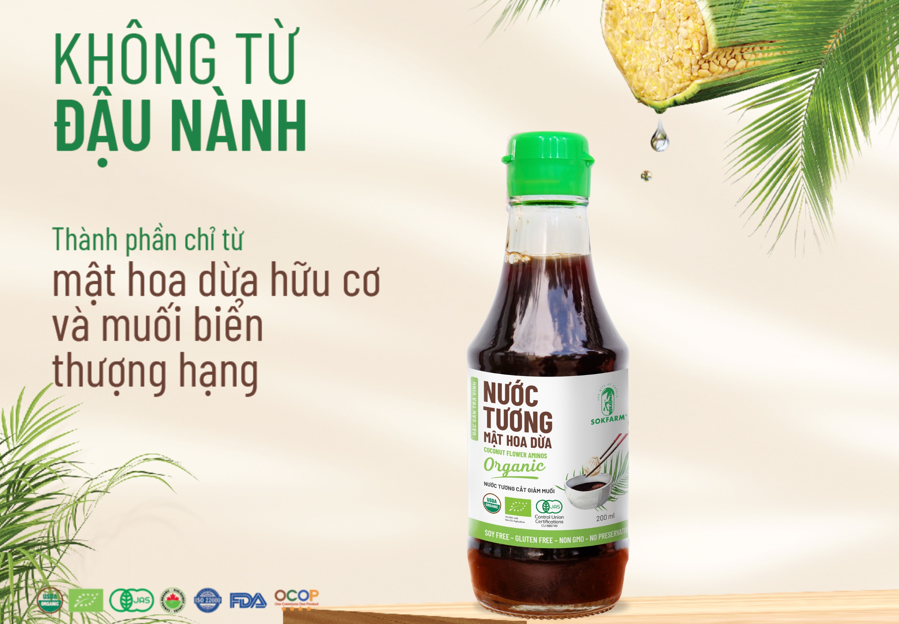 Không phụ gia, không chất điều vị, không chất bảo quản – sản phẩm này chinh phục hoàn toàn những ai theo đuổi triết lý “ăn sạch”. Với mật hoa dừa hữu cơ được thu thủ công từ các chú nông dân thu mật hoa dừa tại Trà Vinh và muối biển Sa Huỳnh tại Quảng Ngãi, nước tương Sokfarm đảm bảo tính nguyên bản, lành mạnh, hữu cơ cho người tiêu dùng.