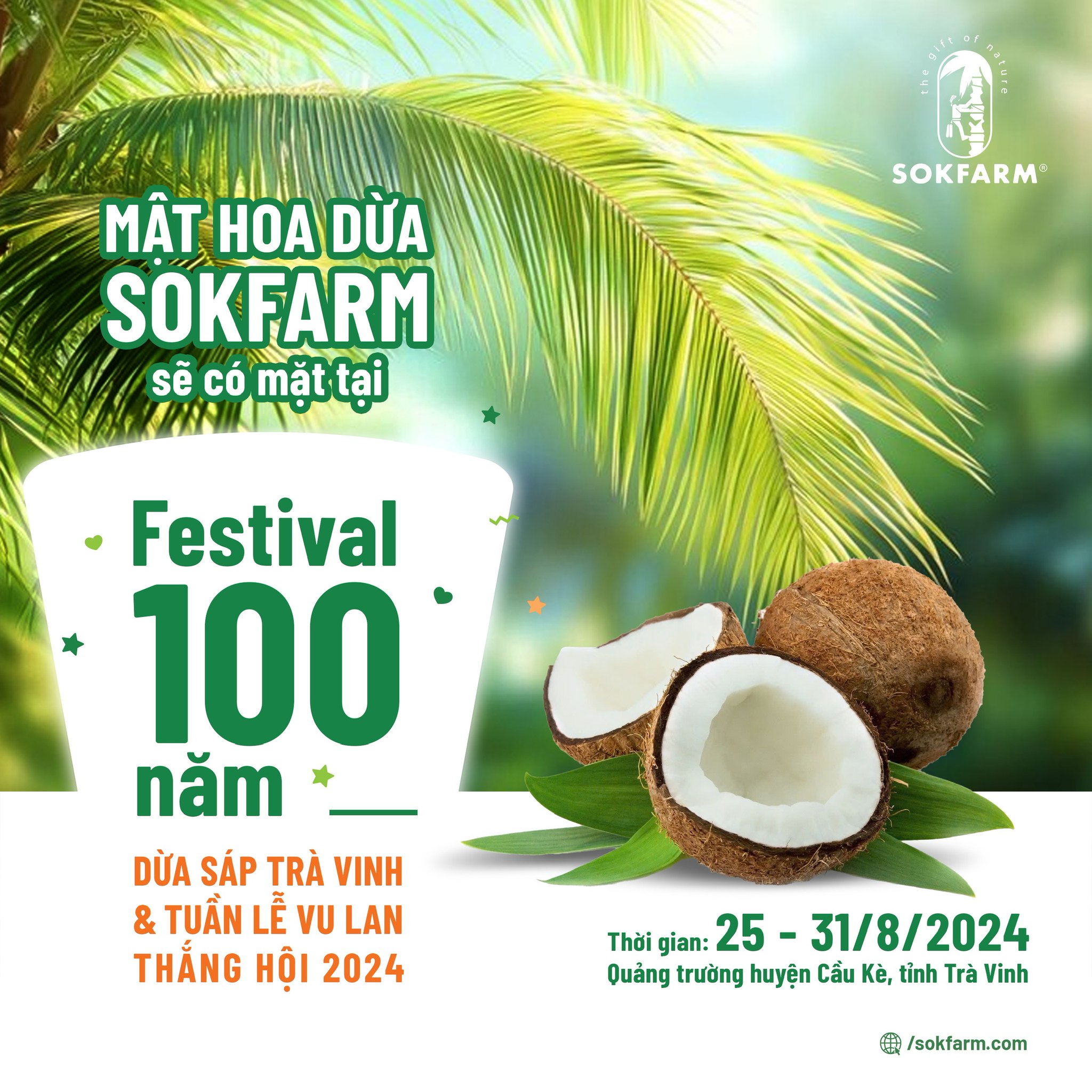 Tháng 8 này, Sokfarm sẽ tham gia lễ hội 100 năm Dừa Sáp Trà Vinh, diễn ra từ ngày 25/08 đến 31/08, hứa hẹn sẽ mang lại nhiều trải nghiệm thú vị và kỷ niệm đẹp. Đây là lần đầu tiên, Festival 100 năm Dừa Sáp Trà Vinh và Tuần lễ Vu Lan Thắng hội được tổ chức nhằm tôn vinh và quảng bá thương hiệu cũng như những giá trị độc đáo của dừa sáp - một đặc sản nổi tiếng của Trà Vinh.