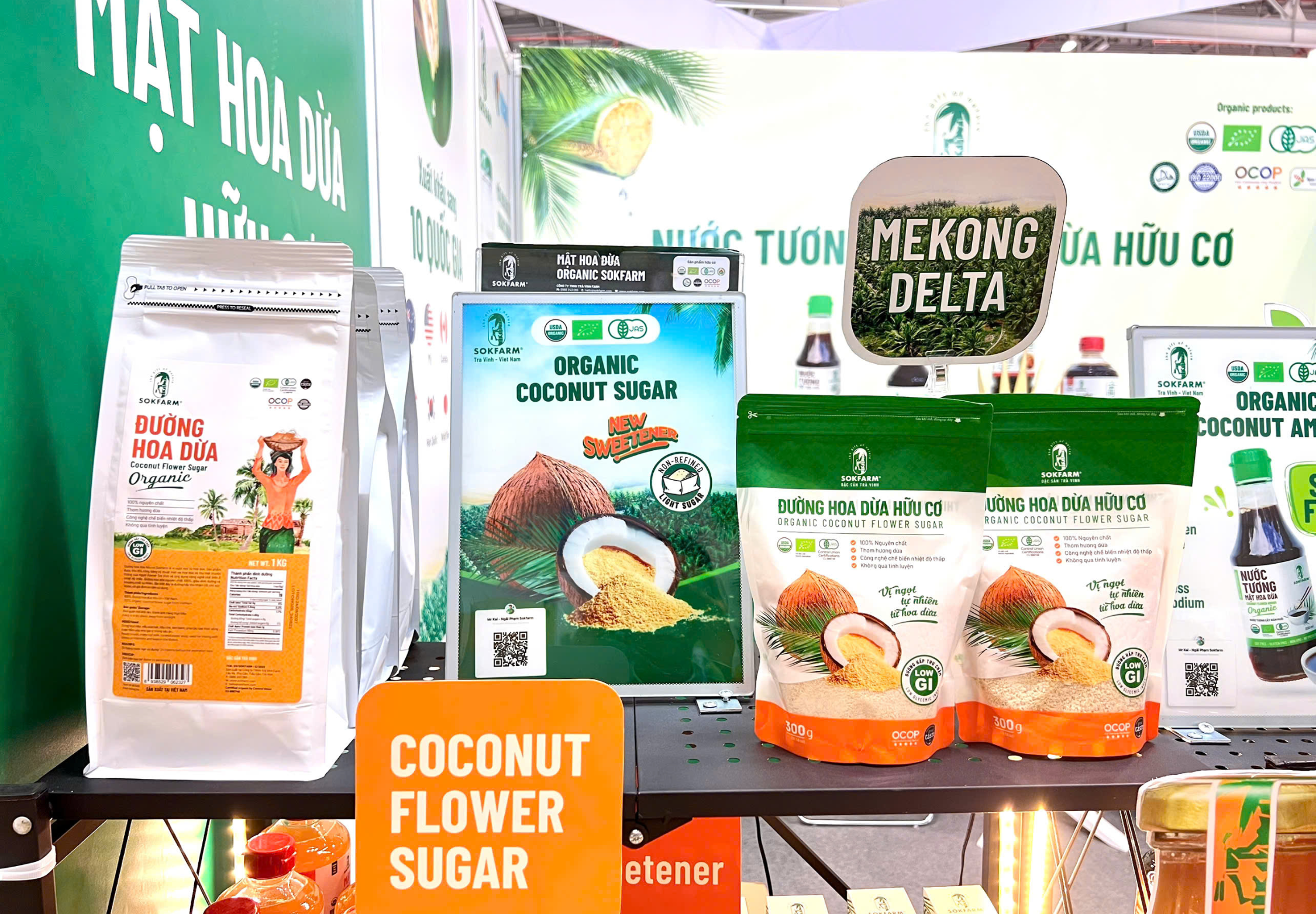 Trong bức tranh đa sắc màu của hội chợ, Sokfarm nổi bật với hành trình tiên phong phát triển các sản phẩm từ mật hoa dừa hữu cơ – một nguồn nguyên liệu bản địa giàu giá trị tại Trà Vinh. Được sản xuất theo quy trình đạt chuẩn quốc tế USDA, EU, JAS, Canada Organic, các sản phẩm của Sokfarm không chỉ đáp ứng nhu cầu ngày càng cao về thực phẩm organic, mà còn góp phần định hình một giải pháp dinh dưỡng và nguyên liệu bền vững cho tương lai.