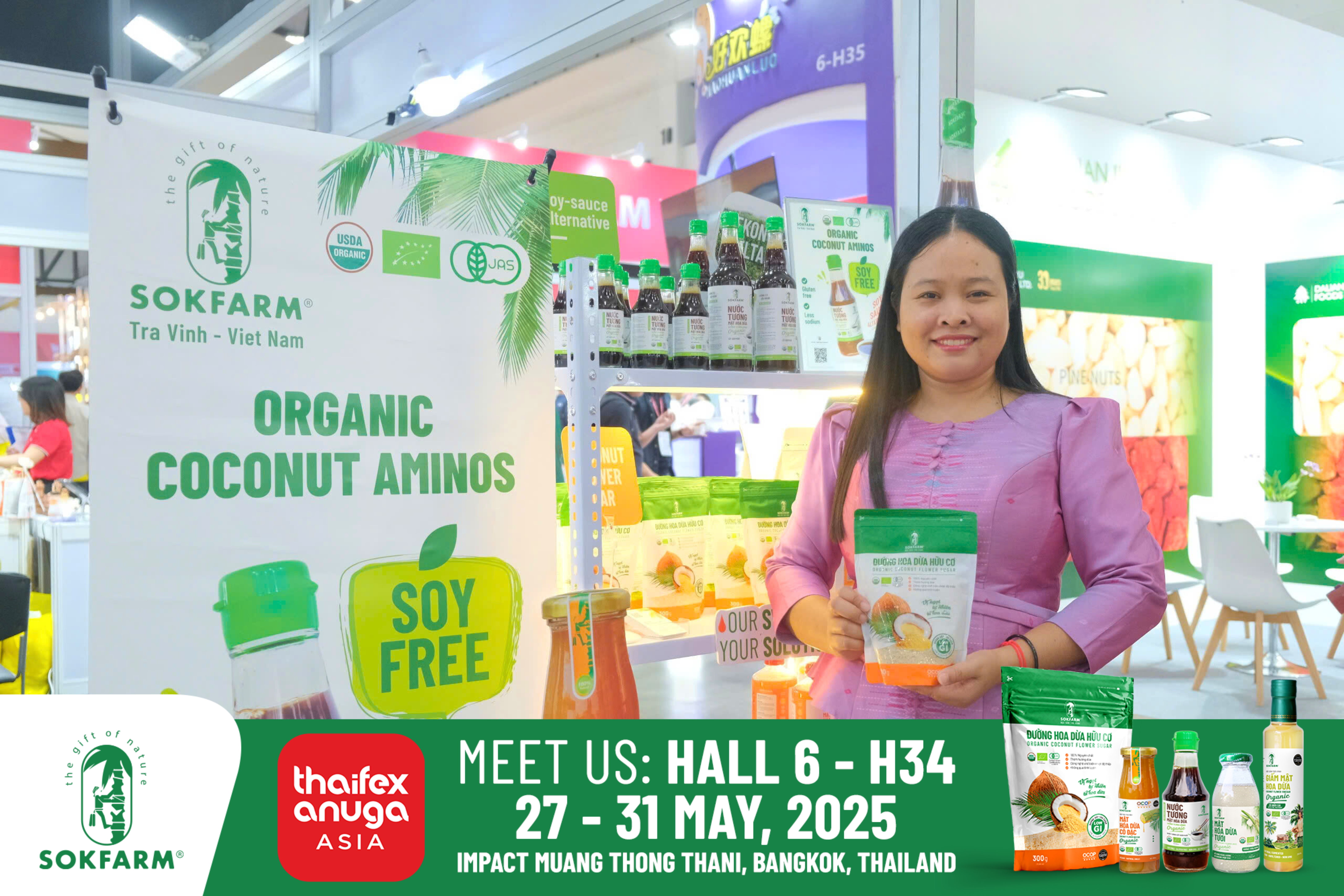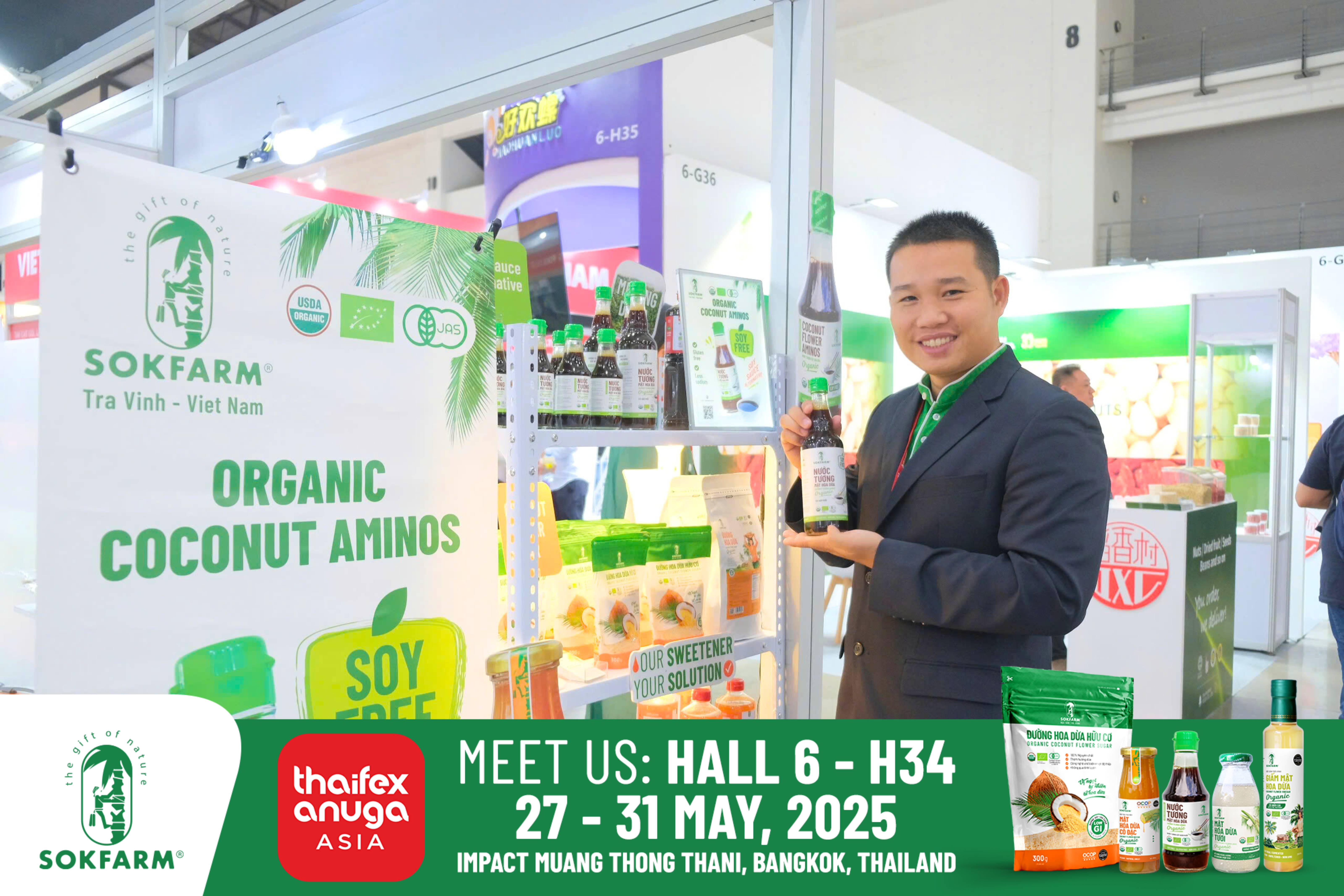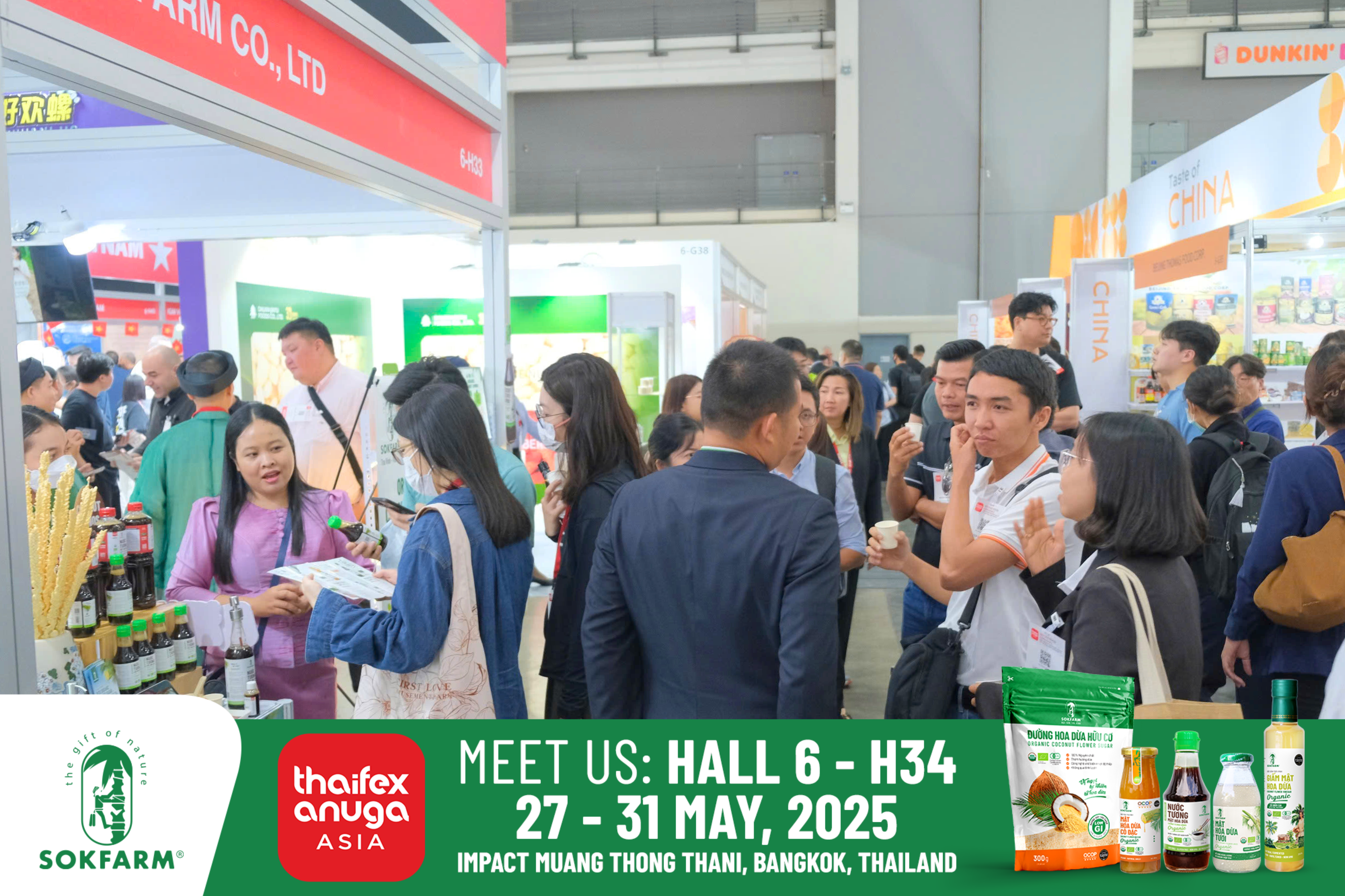Từ ngày 27 – 31/5/2025, Sokfarm – thương hiệu tiên phong trong ngành mật hoa dừa hữu cơ – sẽ chính thức tham gia Thaifex - Anuga Asia tại Bangkok, Thái Lan. Đây là cơ hội để thực phẩm Việt vươn tầm quốc tế với các sản phẩm từ mật hoa dừa hữu cơ – những lựa chọn lành mạnh theo xu hướng tiêu dùng hữu cơ toàn cầu.