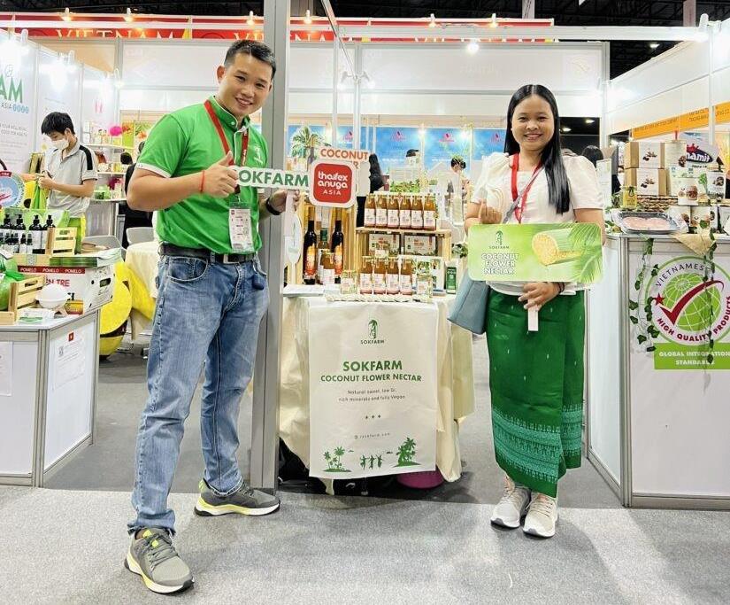 Chị Thạch Thị Chal Thy cùng chồng và sản phẩm mật hoa dừa tại Hội chợ chuyên ngành ẩm thực và đồ uống THAIFEX 2022. Ảnh: Thúy Hạnh