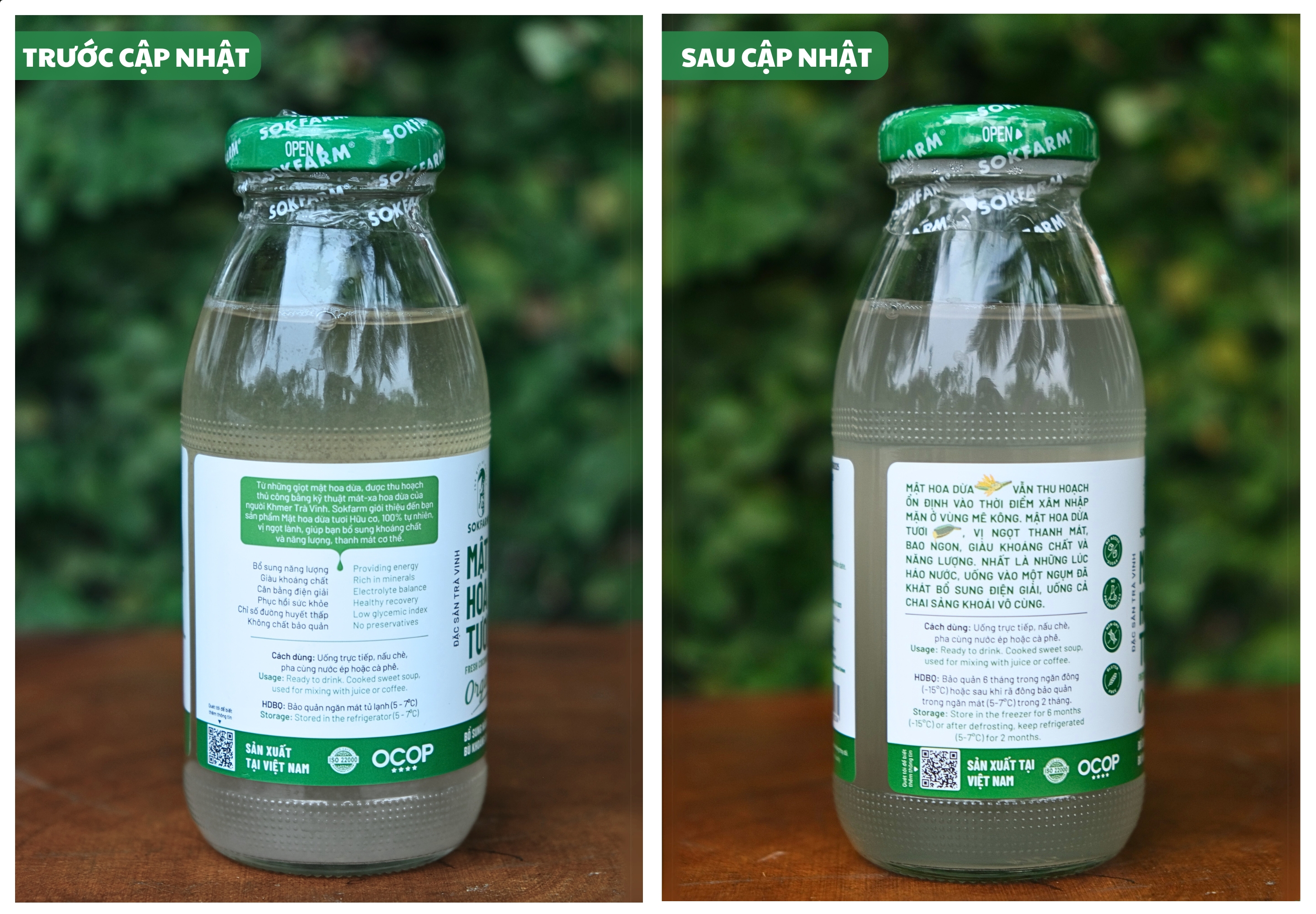 - Sau khi thay đổi: “Mật hoa dừa có thể bị lắng và sậm màu, nhưng chất lượng sản phẩm không thay đổi.”