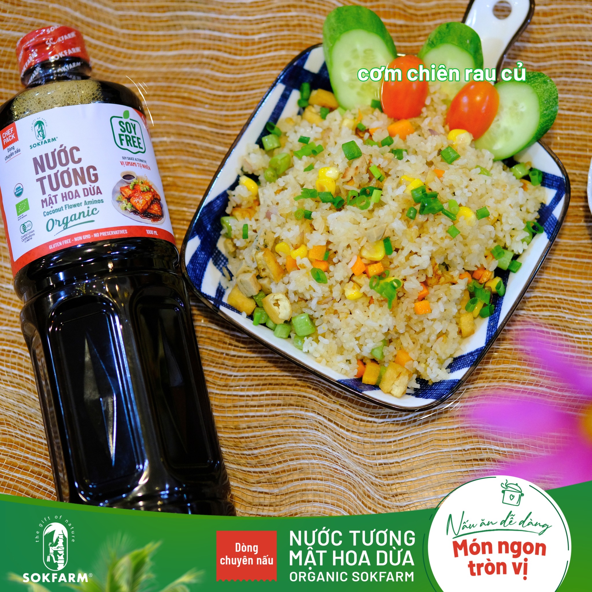 Món cơm chiên rau củ cùng nước tương mật hoa dừa hữu cơ Sokfarm hấp dẫn