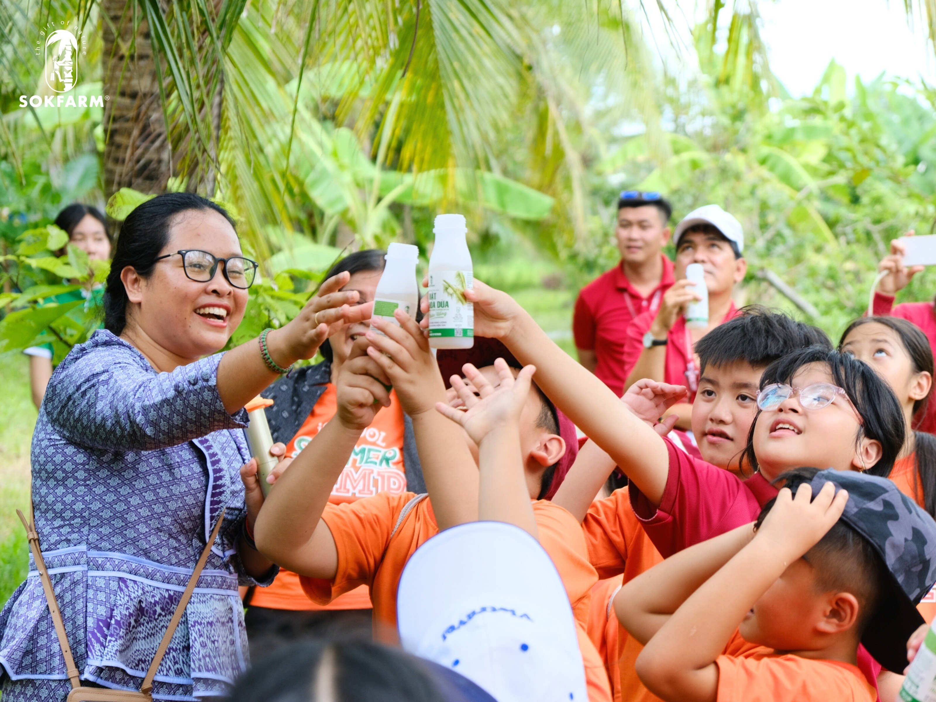 Các em nhỏ hào hứng trải nghiệm mật hoa dừa hữu cơ Sokfarm, thức uống ngọt lành từ thiên nhiên