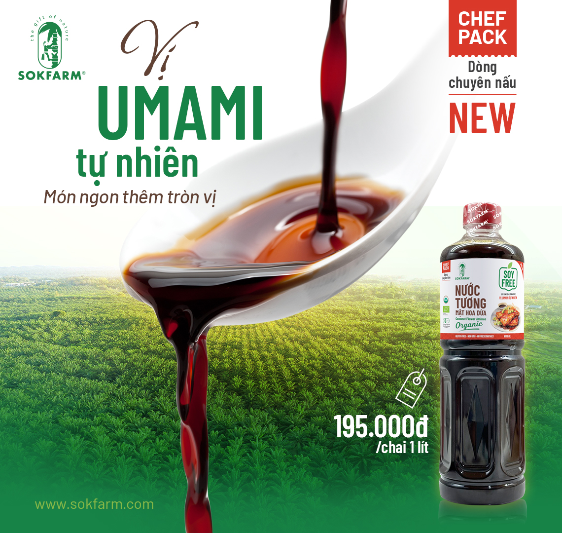 Mới đây, Sokfarm đã cho ra mắt Nước tương mật hoa dừa Organic Sokfarm dòng chuyên nấu - hứa hẹn là trợ thủ đắc lực cho mọi gian bếp. Hãy khám phá và trải nghiệm vị Umami tự nhiên, nâng tầm món ngon cho gia đình bạn với Nước tương mật hoa dừa Organic Sokfarm nhé!