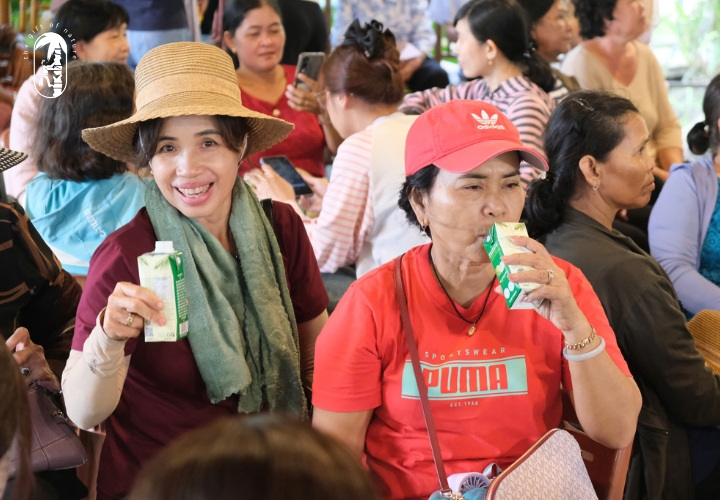 Khách hàng bù điện giải bằng Nước mật hoa dừa tươi hữu cơ Sokfarm sau khi tham quan vườn dừa tại Sokfarm