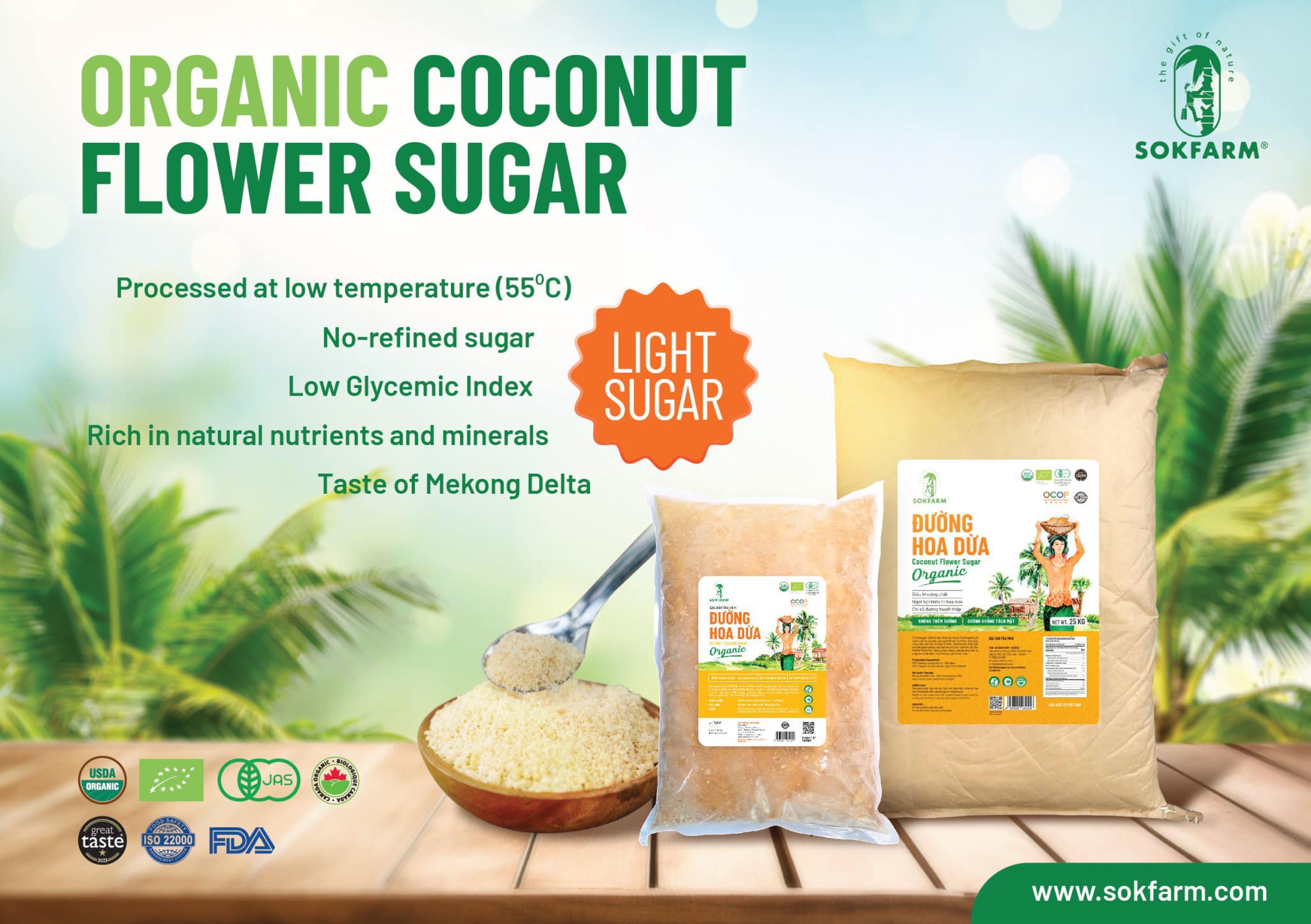 Hiện nay Sokfarm là công ty duy nhất tại Việt Nam sản xuất đường hoa dừa hữu cơ đạt chứng nhận quốc tế của USDA, JAS, EU, CANADA ORGANIC. Nhà máy được đặt tại vùng trồng dừa hữu cơ nên luôn đạt được chất lượng nguyên liệu từ đầu vào đến đầu ra thành phẩm. Chúng tôi luôn đảm bảo chất lượng và sản lượng ổn định để cung cấp nguyên liệu đường hoa dừa cho các cơ sở, nhà máy chế biến, điển hình là với sản phẩm trà hòa tan lá tía tô mật hoa dừa, trà kombucha mật hoa dừa,...