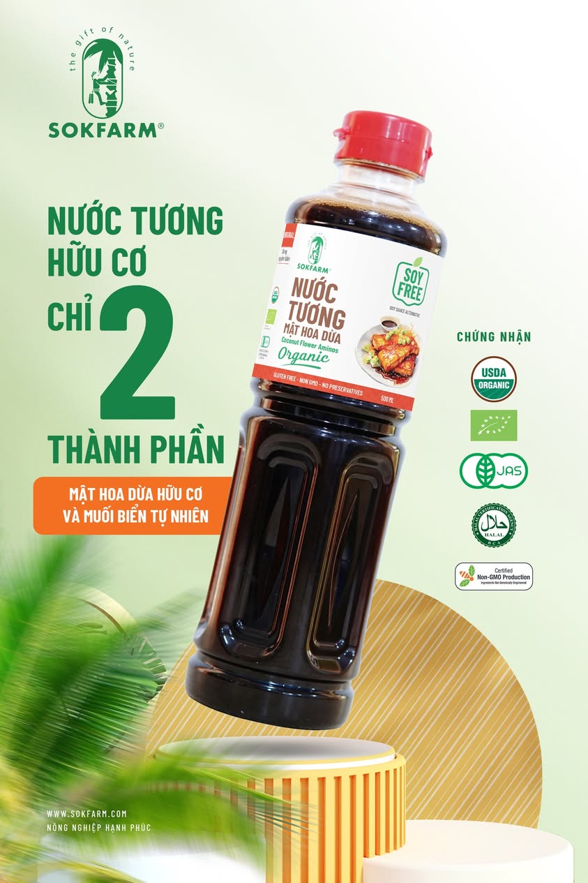Nước tương từ mật hoa dừa của nhà Sokfarm chỉ chứa 2 thành phần duy nhất: mật hoa dừa và muối biển; không chứa chất bảo quản hay bất kỳ chất tạo mùi