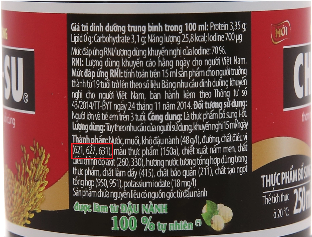 Nước tương công nghiệp thường chứa nhiều chất điều vị, bảo quản và hương liệu như 621, 631, 202, kali iodid,...