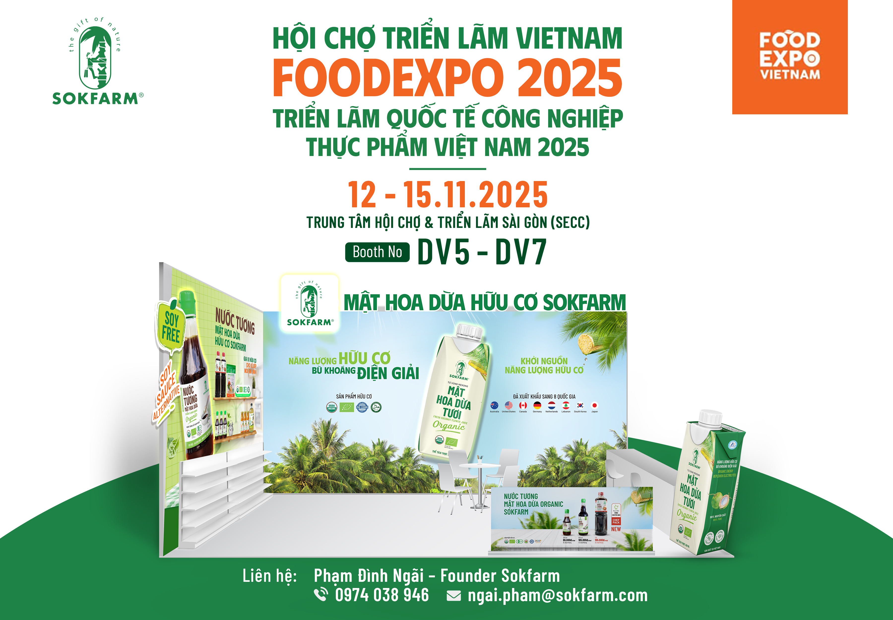 Vietnam Foodexpo là sự kiện thường niên quy mô nhất của ngành thực phẩm Việt Nam, kết nối các doanh nghiệp với đối tác trong và ngoài nước. Với hơn 500 gian hàng từ gần 400 doanh nghiệp, triển lãm không chỉ là nơi quảng bá sản phẩm mà còn là cơ hội để các thương hiệu tìm kiếm hợp tác, học hỏi, và tiếp cận xu hướng tiêu dùng mới trong ngành thực phẩm và đồ uống. Tại đây, Sokfarm sẽ giới thiệu các sản phẩm mật hoa dừa hữu cơ tự nhiên – một lựa chọn mới để bạn thay thế các loại đường tinh luyện, mang lại vị ngọt lành và giàu giá trị dinh dưỡng.