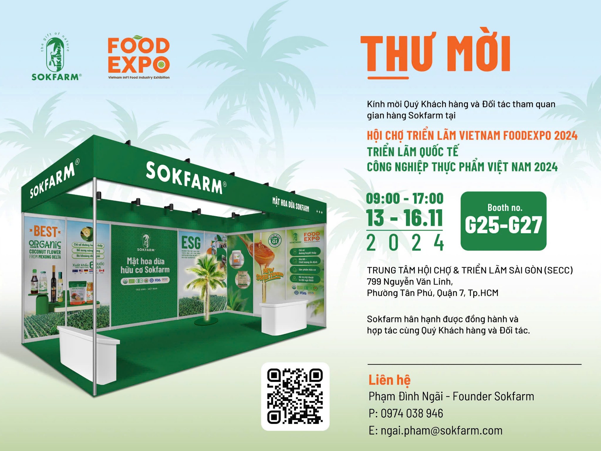Sokfarm trân trọng mời bạn đến tham quan gian hàng G25 - G27 tại Vietnam Foodexpo 2024 để trải nghiệm hương vị tự nhiên từ mật hoa dừa và khám phá những ứng dụng độc đáo của loại nguyên liệu này. Đây không chỉ là dịp để bạn hiểu rõ hơn về mật hoa dừa Sokfarm – sản phẩm ngọt tự nhiên bền vững, mà còn là cơ hội để tìm kiếm giải pháp nguyên liệu cho sản phẩm của bạn trong tương lai.