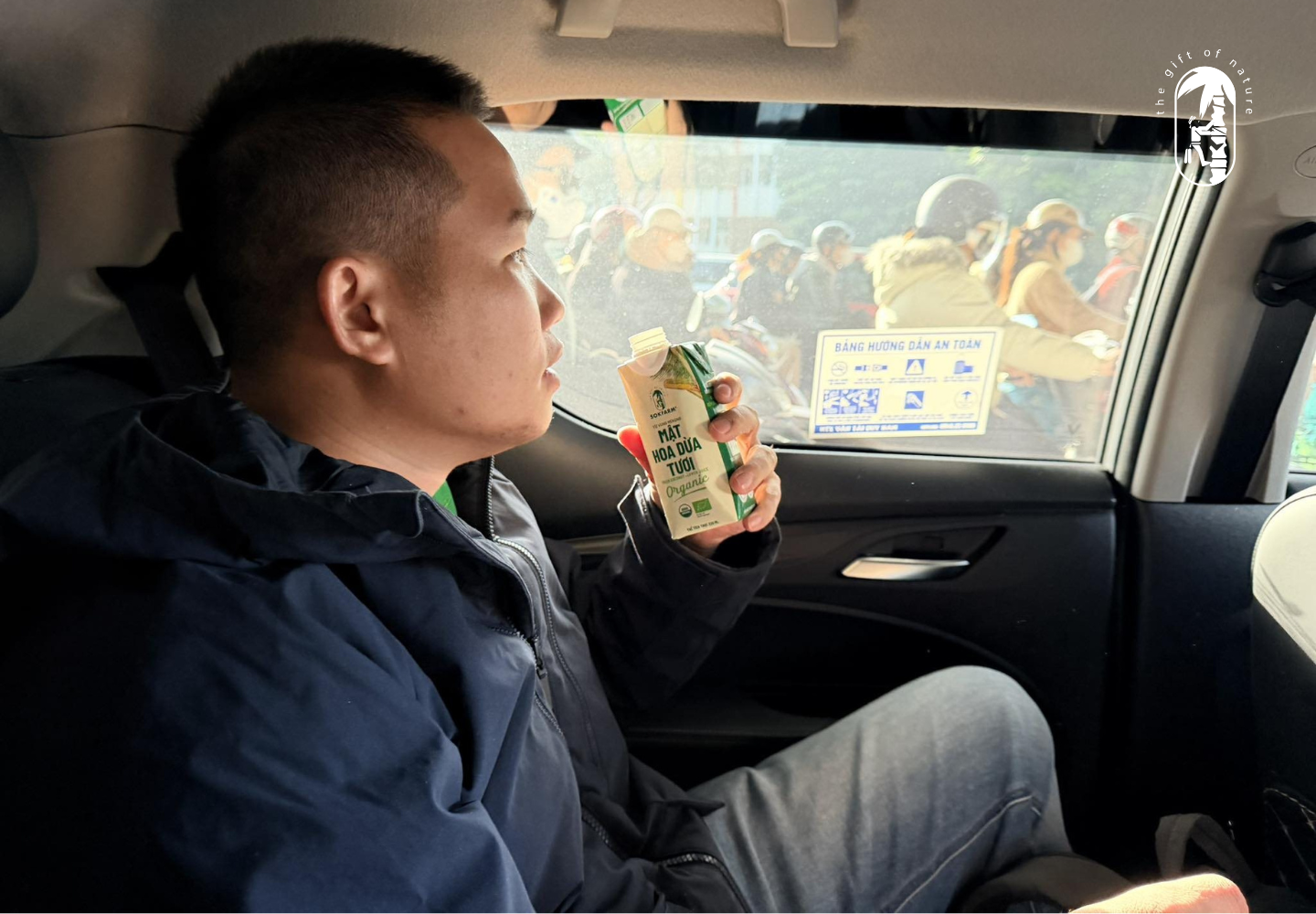Sử dụng Nước uống mật hoa dừa tươi hữu cơ Sokfarm trong khi đi công tác