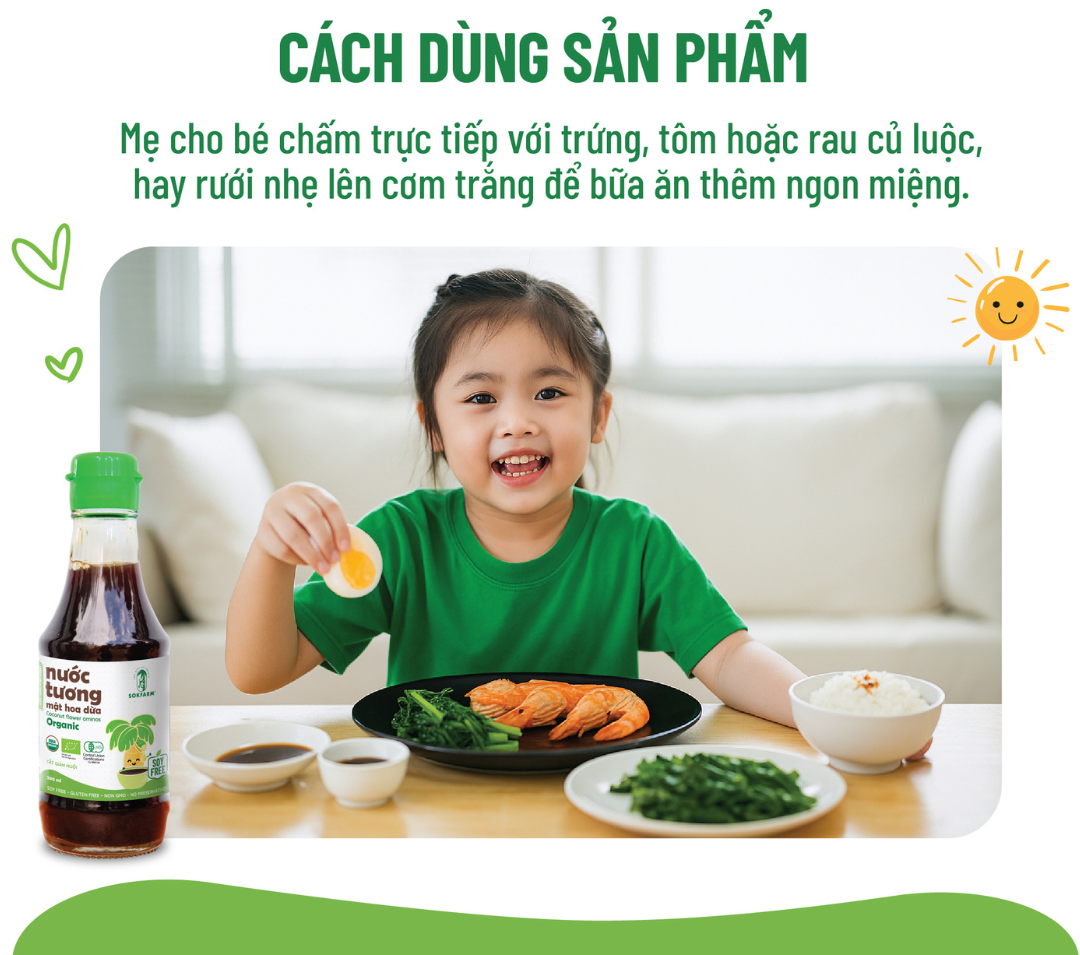 Việc chọn nước tương cho bé không chỉ là tìm một loại gia vị, mà còn là sự quan tâm đến sức khỏe lâu dài của con. Với 5 lưu ý trên, mẹ sẽ dễ dàng chọn được sản phẩm an toàn, tự nhiên, ít muối, phù hợp cho trẻ ăn dặm. Nước tương mật hoa dừa Sokfarm chính là lựa chọn gợi ý để bữa ăn của bé thêm ngon miệng mà vẫn trọn vẹn dinh dưỡng.