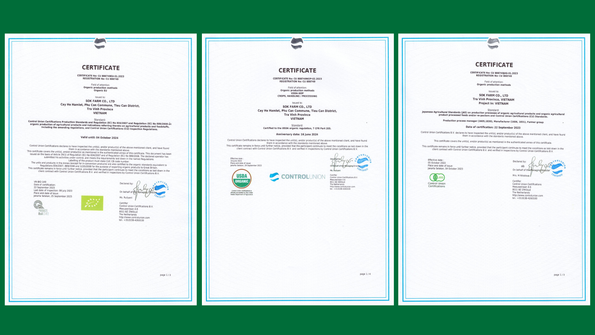 Sản phẩm đã đạt được hàng loạt chứng nhận hữu cơ uy tín như USDA, EU, JAS, Canada Organic và tiêu chuẩn ISO 22000:2018, cùng chứng nhận OCOP 5 sao – minh chứng rõ ràng cho chất lượng và độ an toàn của sản phẩm.