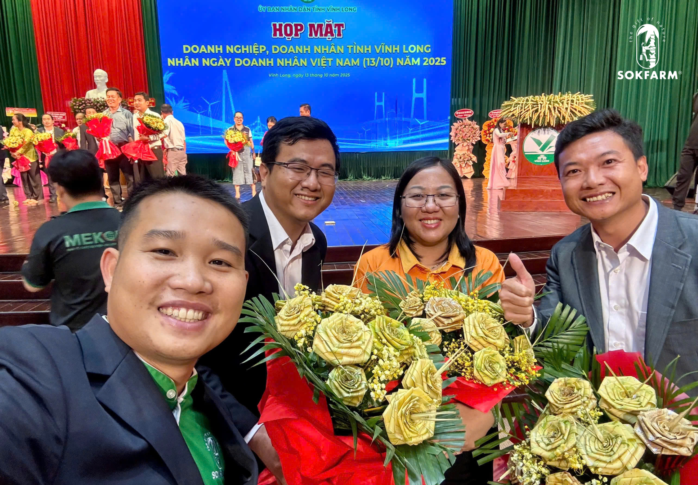 Tại lễ họp mặt Ngày Doanh nhân Việt Nam 2025, UBND tỉnh Vĩnh Long biểu dương 56 doanh nghiệp và cá nhân xuất sắc, trong đó Sokfarm nổi bật với hai thành tích ấn tượng: