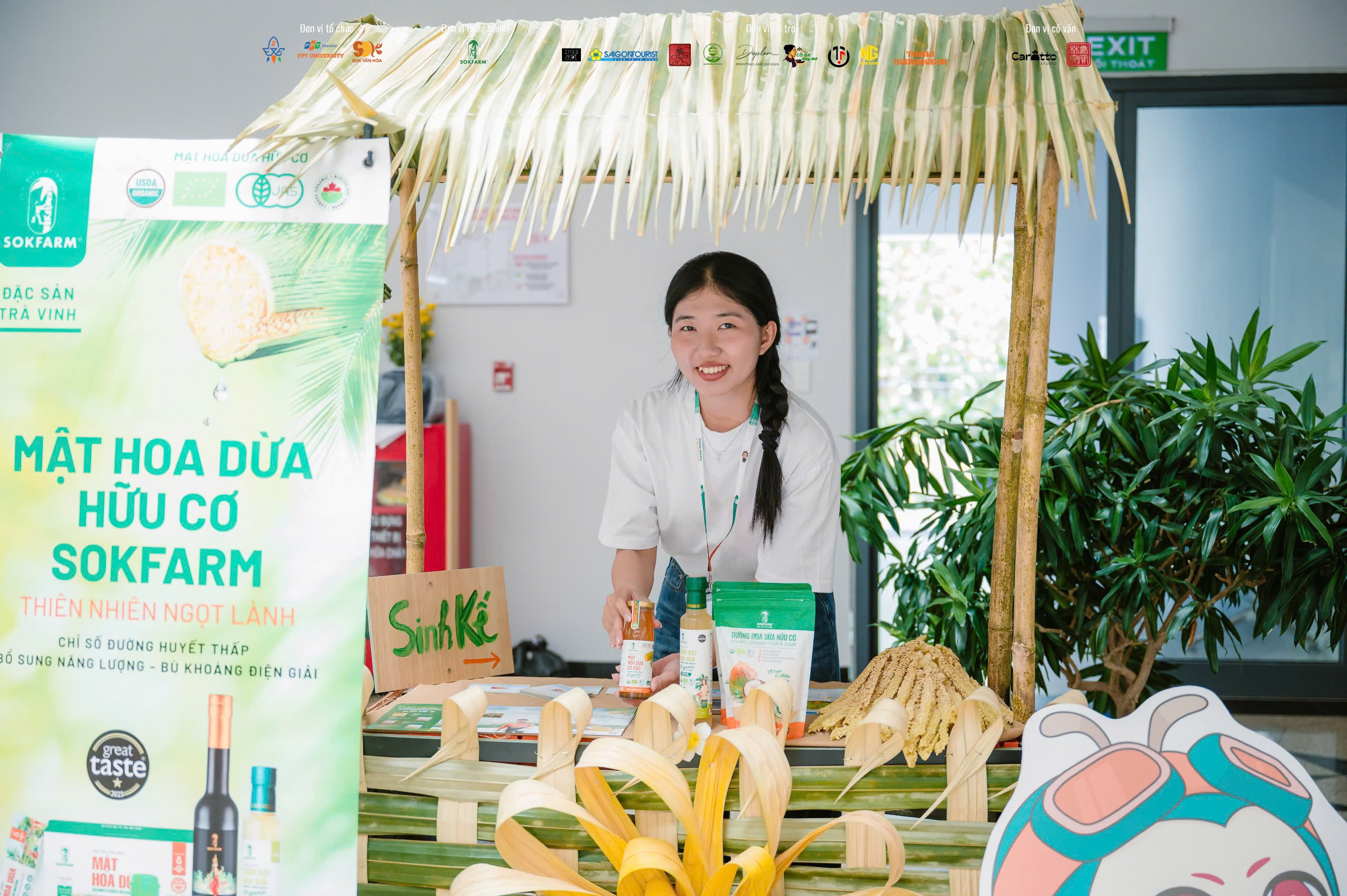 Trong khuôn khổ sự kiện, các bạn sinh viên đã tổ chức triển lãm trải nghiệm đa giác quan. Người tham dự được tương tác với mascot “Tiểu Cần Cù” – nhân vật truyền thông đại diện cho thương hiệu mật hoa dừa Sokfarm – qua filter AR.