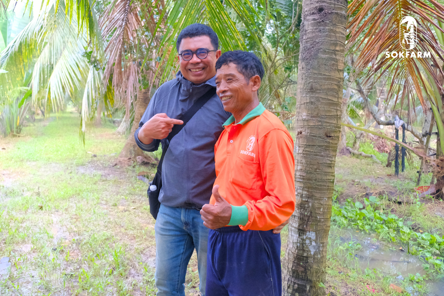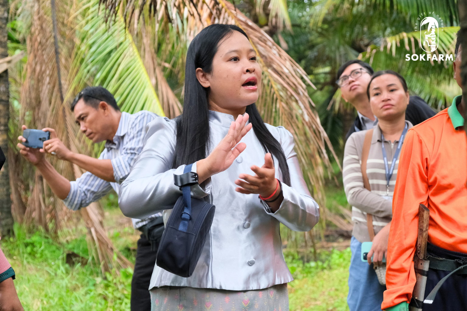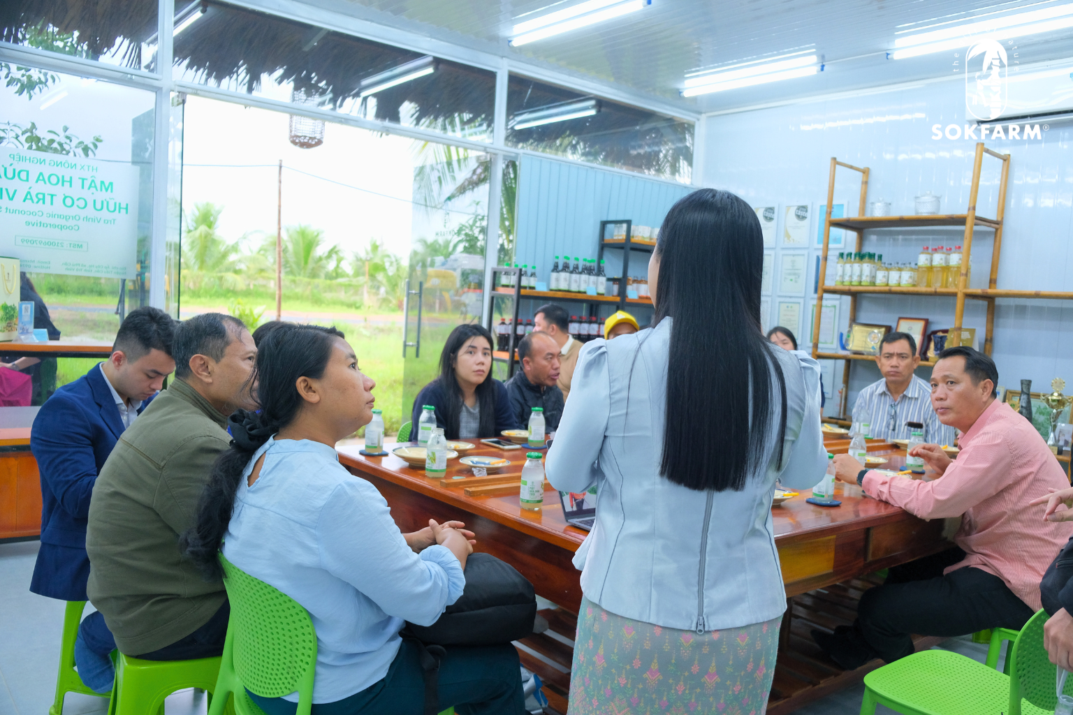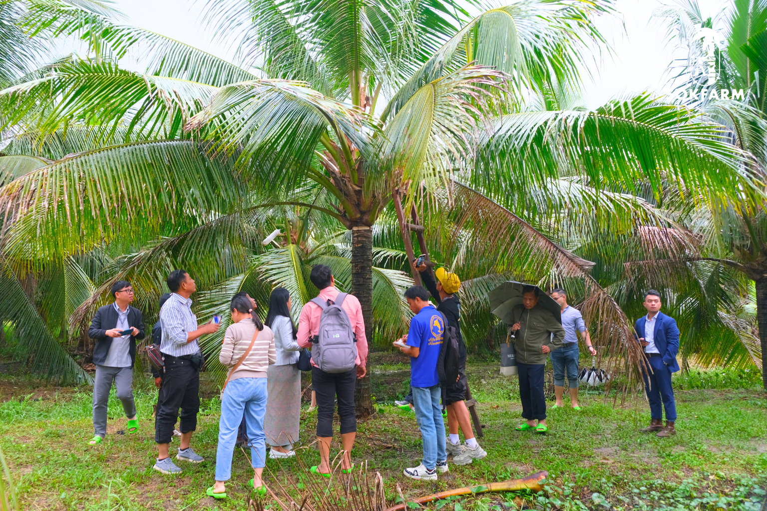 Chuyến tham quan tại Farmstay Sokfarm được tổ chức với mục tiêu vừa tham quan mô hình nông nghiệp thực tế, vừa trao đổi kinh nghiệm hợp tác và phát triển sáng kiến nông nghiệp bền vững. Đoàn được tham quan vườn dừa – nơi Sokfarm triển khai mô hình trồng dừa thu mật theo hướng hữu cơ và bền vững, đồng thời tìm hiểu về các khâu trong quy trình quản trị chuỗi giá trị: từ chăm sóc cây, thu hoạch mật hoa dừa, chế biến đến phân phối sản phẩm.