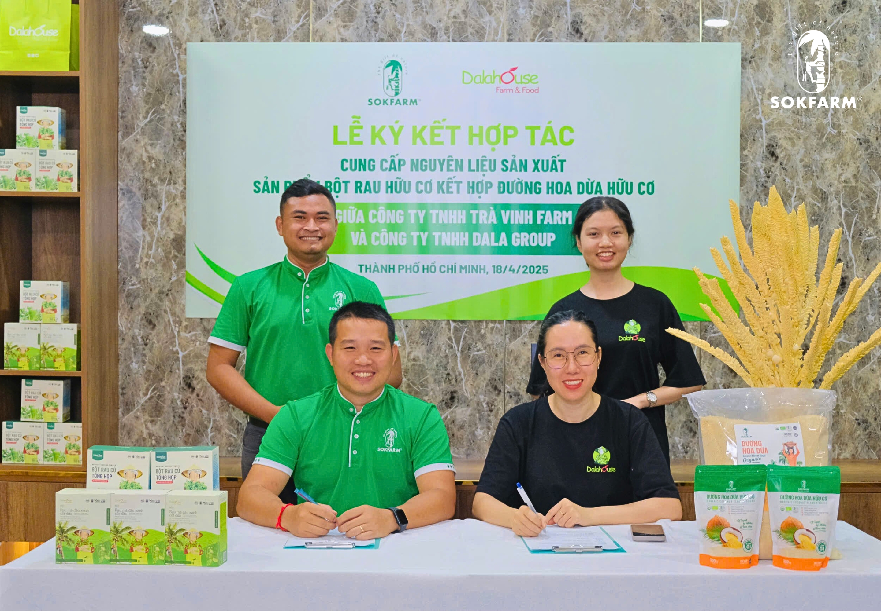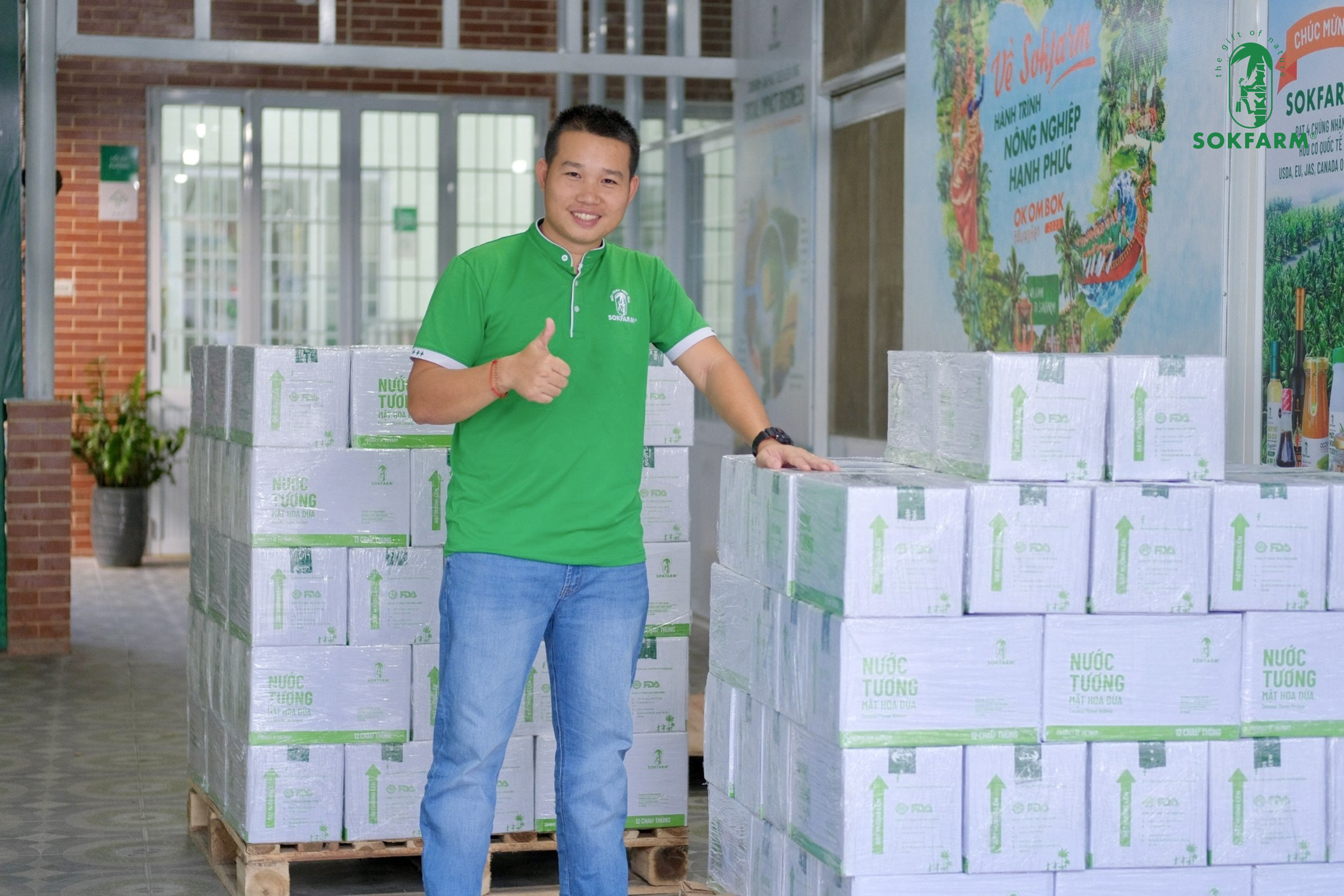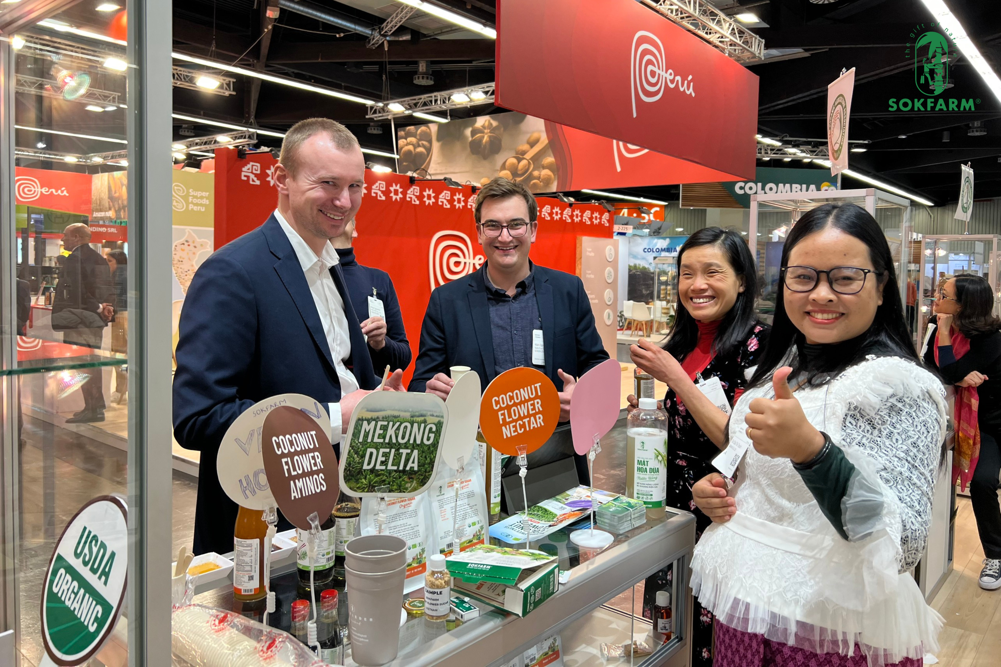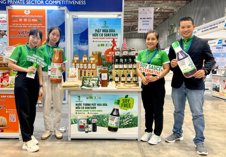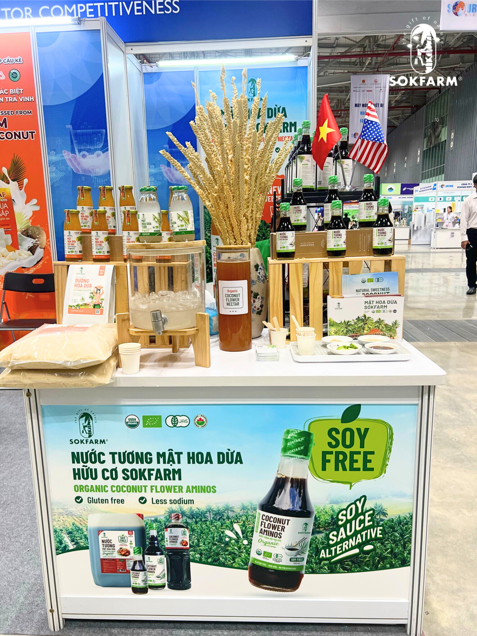 Sokfarm mang đến sự kiện những sản phẩm từ mật hoa dừa đạt tiêu chuẩn hữu cơ quốc tế USDA, EU, JAS, CANADA ORGANIC như: Nước tương mật hoa dừa, Mật hoa dừa cô đặc,