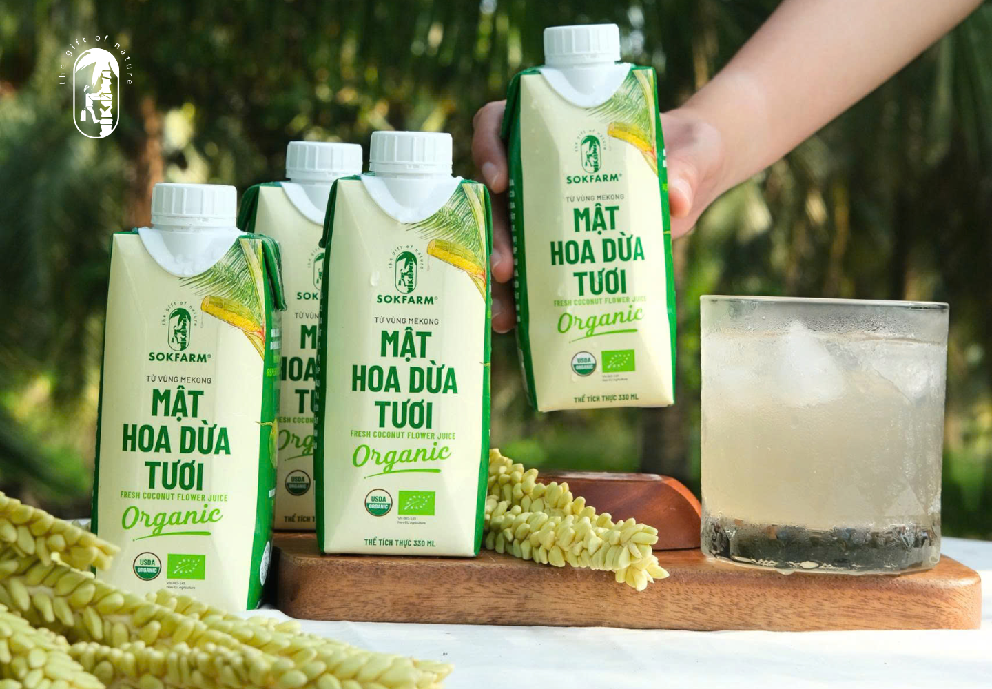 Sokfarm là thương hiệu nổi bật với dòng Nước uống mật hoa dừa tươi được khai thác trực tiếp từ hoa dừa tự nhiên. Đây là nguyên liệu có nguồn gốc từ khu vực Trà Vinh – Vĩnh Long, mang giá trị bản địa rõ ràng.