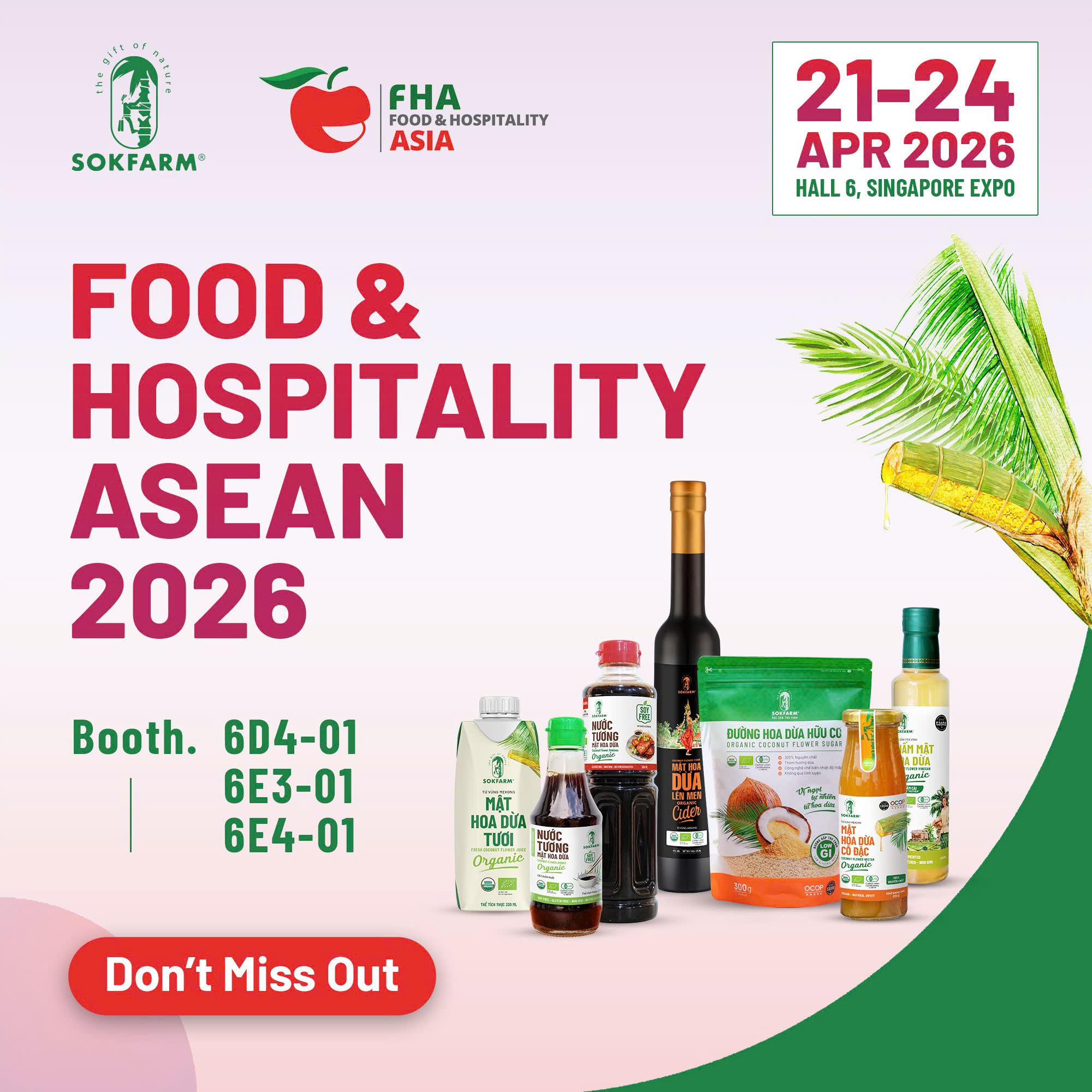 Tại triển lãm lần này, Sokfarm sẽ trưng bày các dòng sản phẩm chủ lực, bao gồm mật hoa dừa tươi UHT, nước tương mật hoa dừa và đường hoa dừa hữu cơ – những giải pháp nguyên liệu tự nhiên dành cho ngành F&B hiện đại.